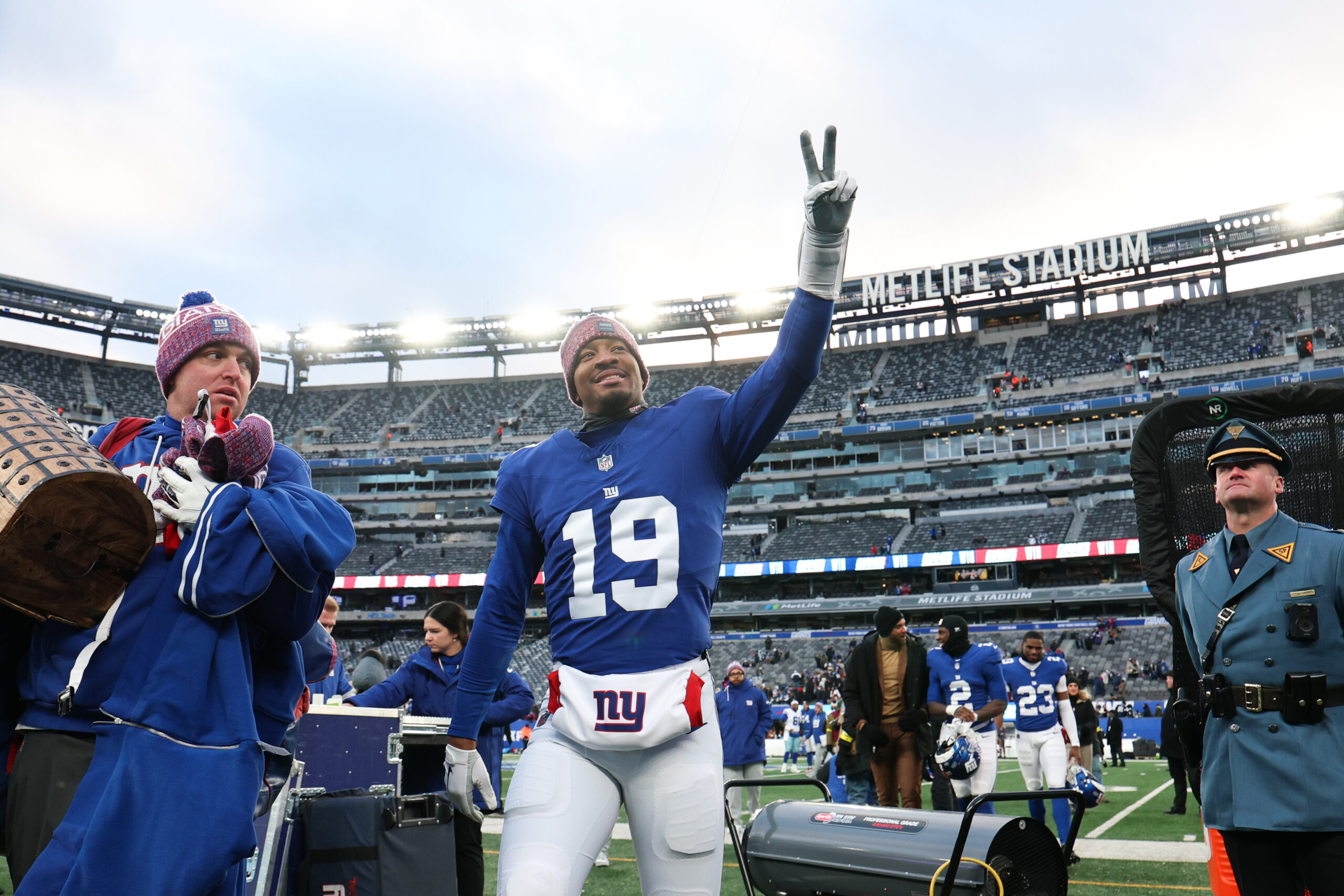 Jan 4, 2026; East Rutherford, New Jersey, USA; New York Giants quarterback Jameis Winston (19) waves to fans after the game against the Dallas Cowboys at MetLife Stadium. Mandatory Credit: Vincent Carchietta-Imagn Images