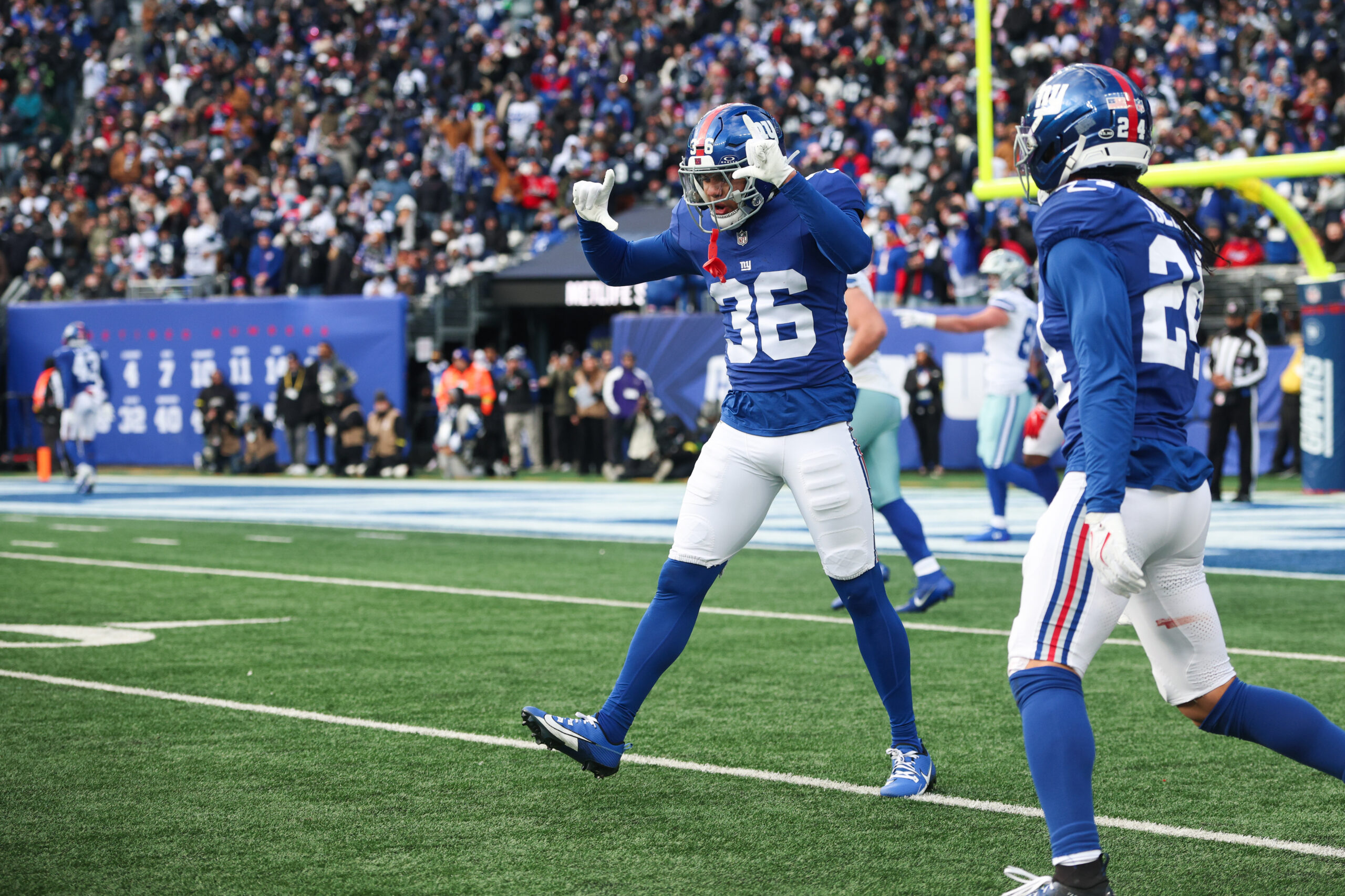 Jan 4, 2026; East Rutherford, New Jersey, USA; New York Giants cornerback Rico Payton (36) celebrates a defensive stop during the second quarter against the Dallas Cowboys at MetLife Stadium. Mandatory Credit: Vincent Carchietta-Imagn Images