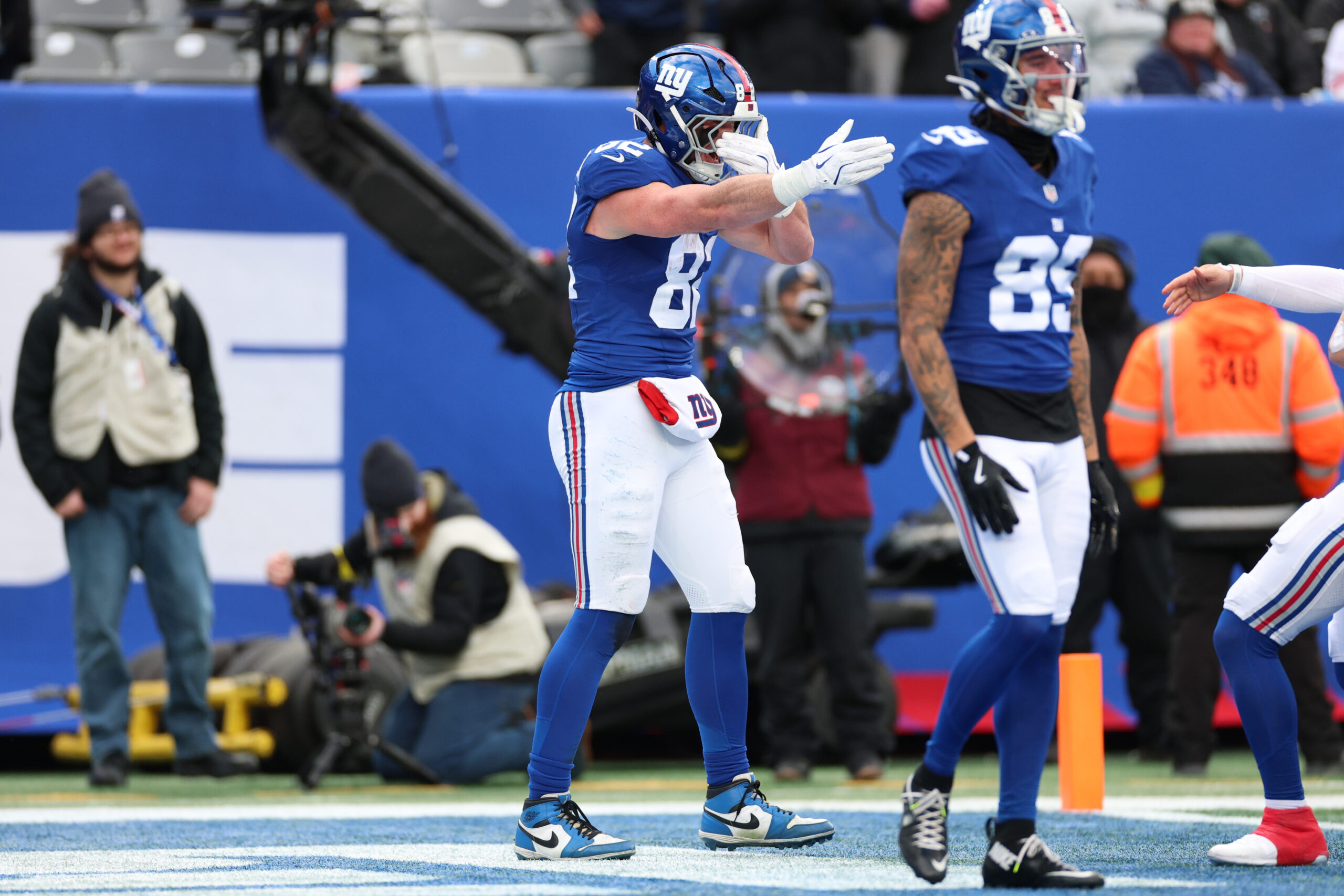 Jan 4, 2026; East Rutherford, New Jersey, USA; New York Giants tight end Daniel Bellinger (82) celebrates after scoring a touchdown during the second quarter against the Dallas Cowboys at MetLife Stadium. Mandatory Credit: Vincent Carchietta-Imagn Images