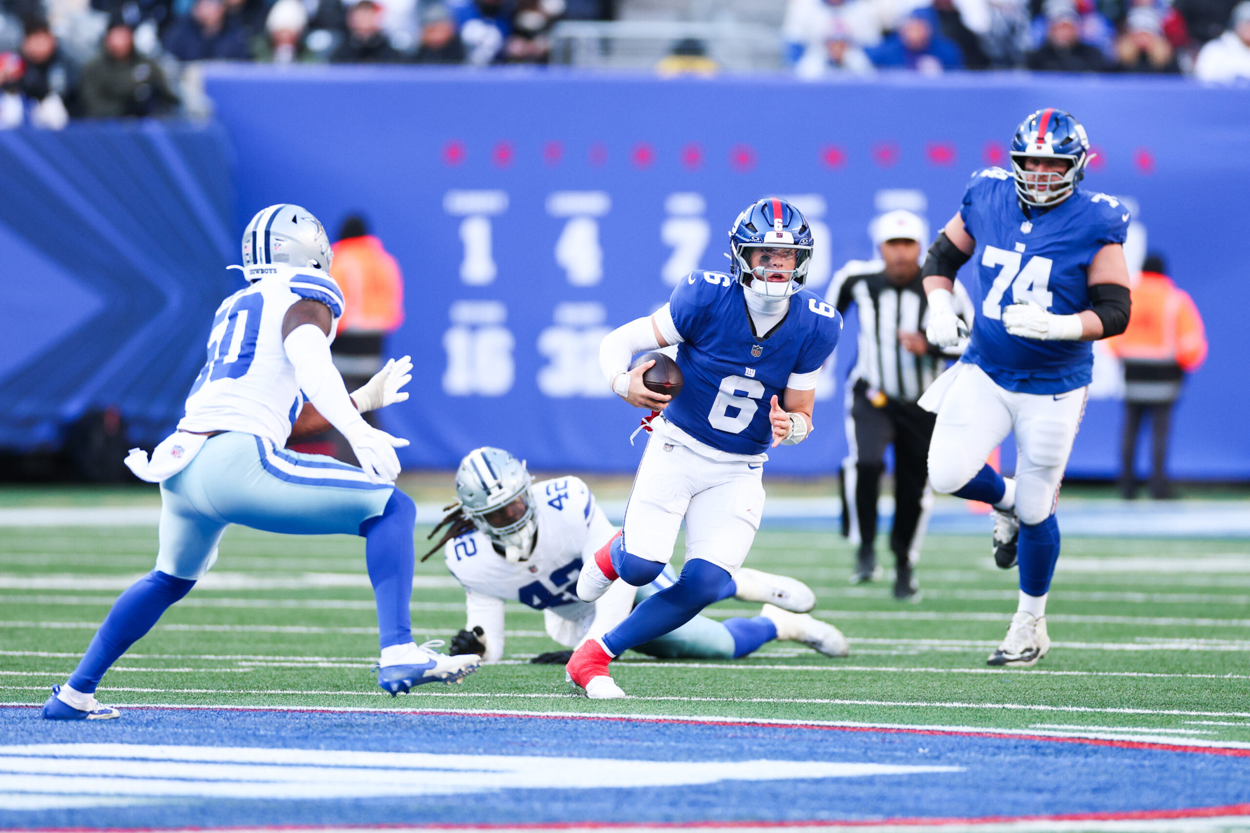 Jan 4, 2026; East Rutherford, New Jersey, USA; New York Giants quarterback Jaxson Dart (6) scrambles as Dallas Cowboys linebacker Shemar James (50) defends during the third quarter at MetLife Stadium. Mandatory Credit: Vincent Carchietta-Imagn Images