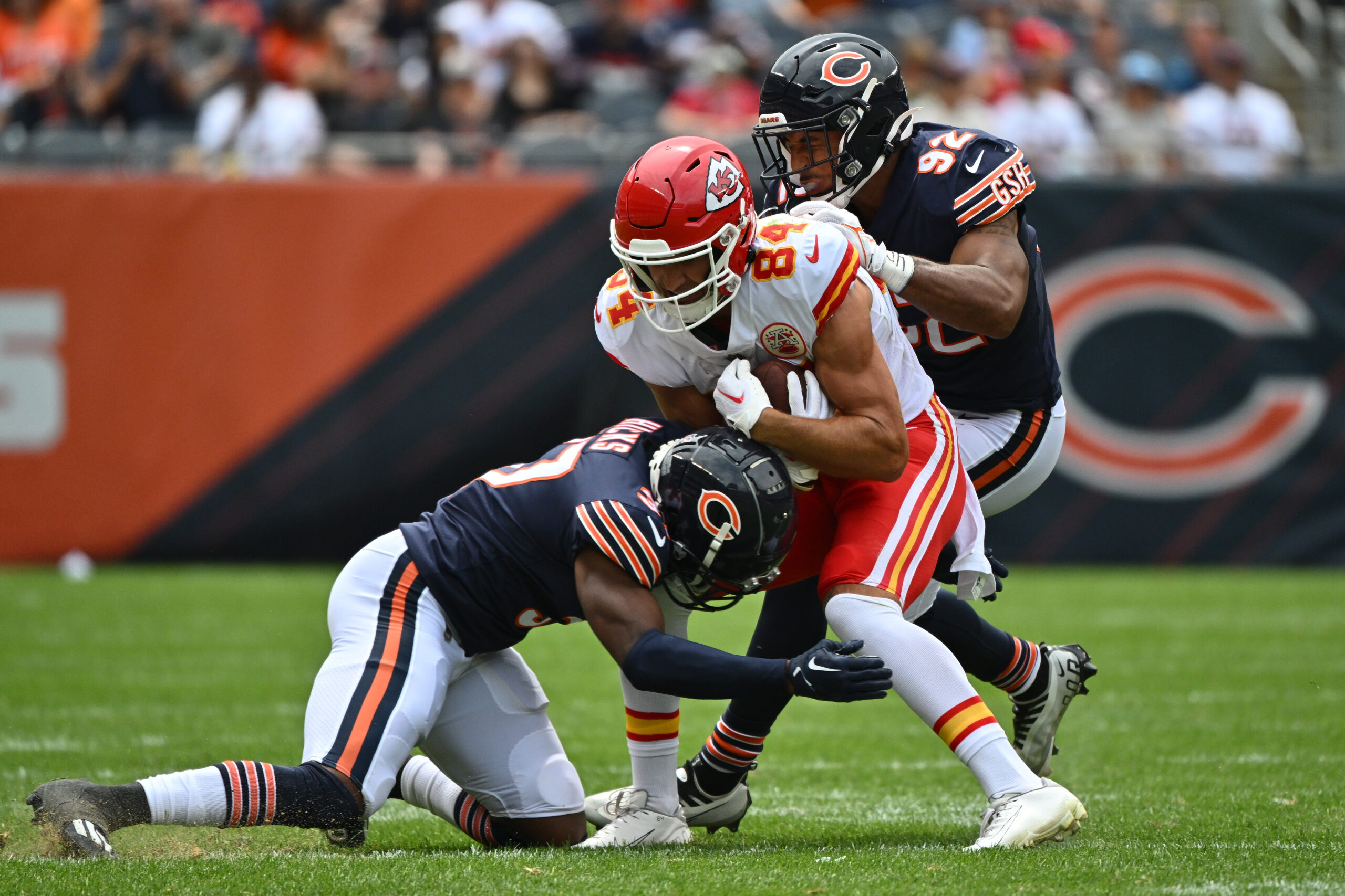 Aug 13, 2022; Chicago, Illinois, USA; Kansas City Chiefs wide receiver Justin Watson (84) is brought down after a short pass reception by Chicago Bears defensive back Elijah Hicks (37), bottom, and linebacker Caleb Johnson (92) in the second quarter at Soldier Field. Mandatory Credit: Jamie Sabau-Imagn Images
