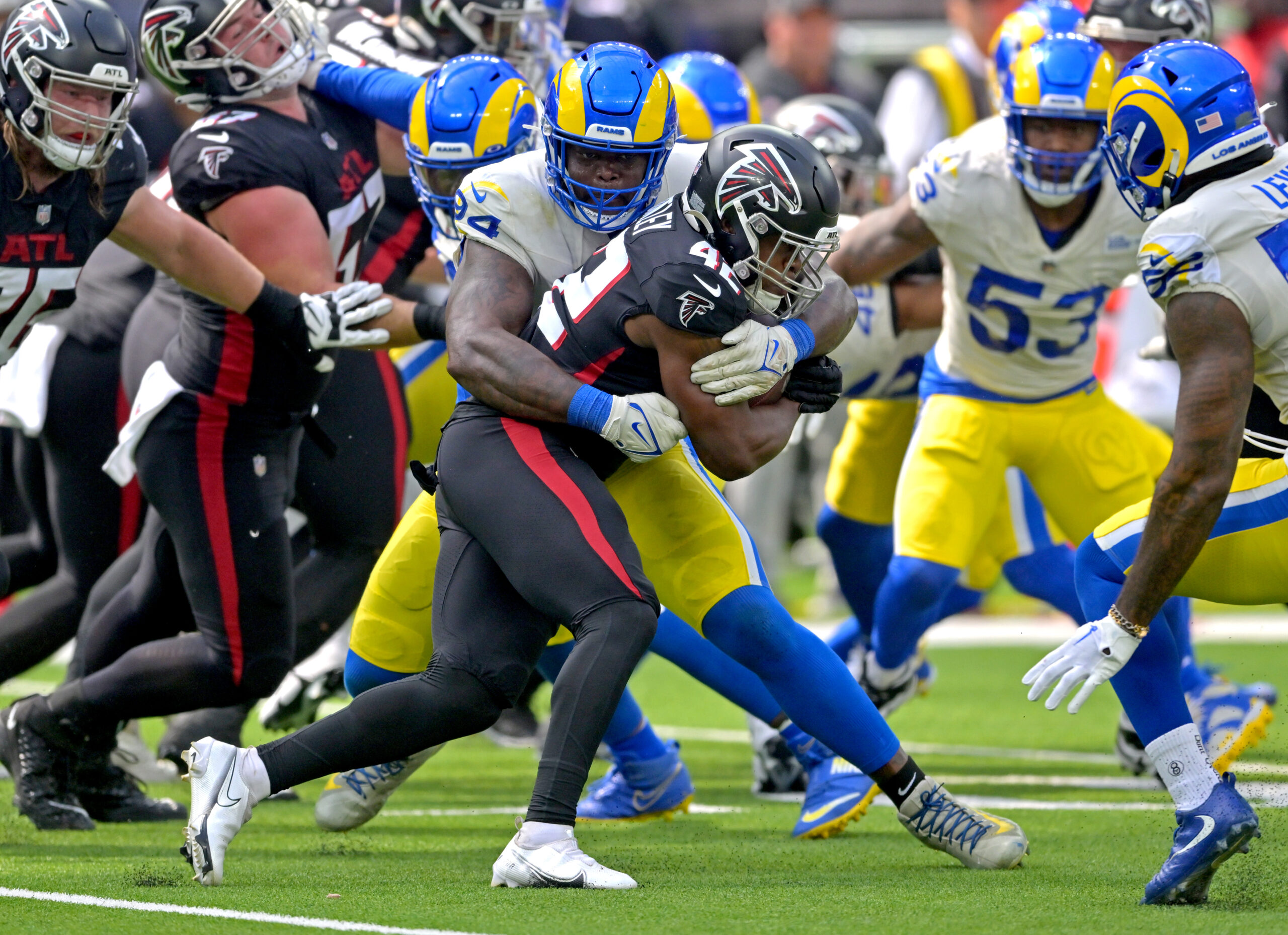 Sep 18, 2022; Inglewood, California, USA; Los Angeles Rams defensive tackle A’Shawn Robinson (94) stops Atlanta Falcons running back Caleb Huntley (42) short of a first down in the first half at SoFi Stadium. Mandatory Credit: Jayne Kamin-Oncea-Imagn Images