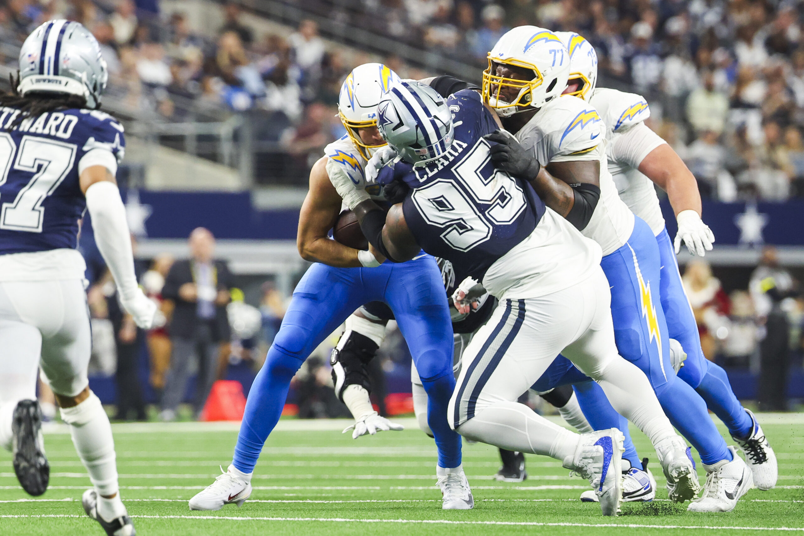 Dec 21, 2025; Arlington, Texas, USA; Dallas Cowboys defensive tackle Kenny Clark (95) tackles Los Angeles Chargers quarterback Justin Herbert (10) for a short gain during the third quarter at AT&T Stadium. Los Angeles Chargers guard Zion Johnson (77) blocks against Clark at right. Mandatory Credit: Kevin Jairaj-Imagn Images