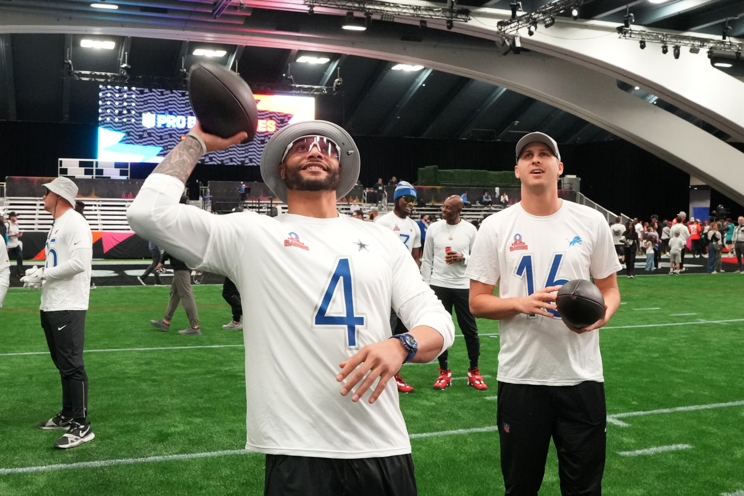 Feb 1, 2026; San Francisco, CA, USA; Dallas Cowboys quarterback Dak Prescott (4) and Detroit Lions quarterback Jared Goff (16) during NFC practice at the Flag Fieldhouse Moscone Center South Building. Mandatory Credit: Kirby Lee-Imagn Images