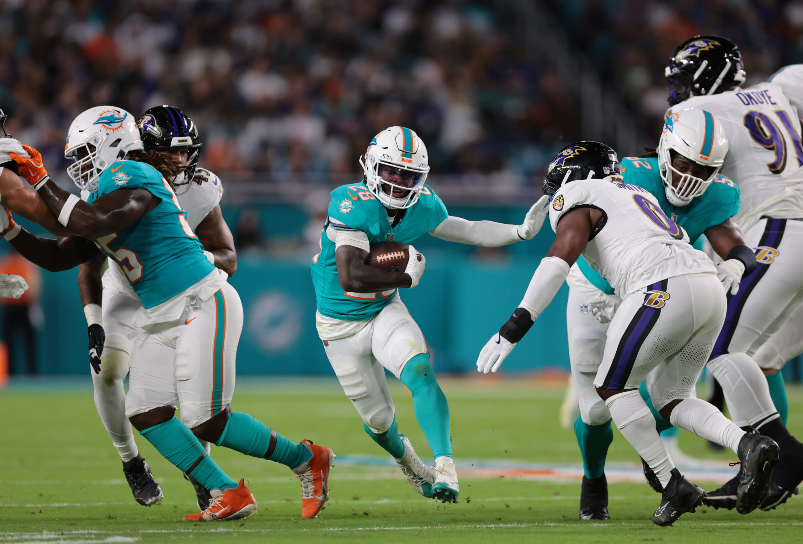 Oct 30, 2025; Miami Gardens, Florida, USA; Miami Dolphins running back De’Von Achane (28) runs for a gain past Baltimore Ravens inside linebacker Roquan Smith (0) during the first quarter at Hard Rock Stadium. Mandatory Credit: Sam Navarro-Imagn Images