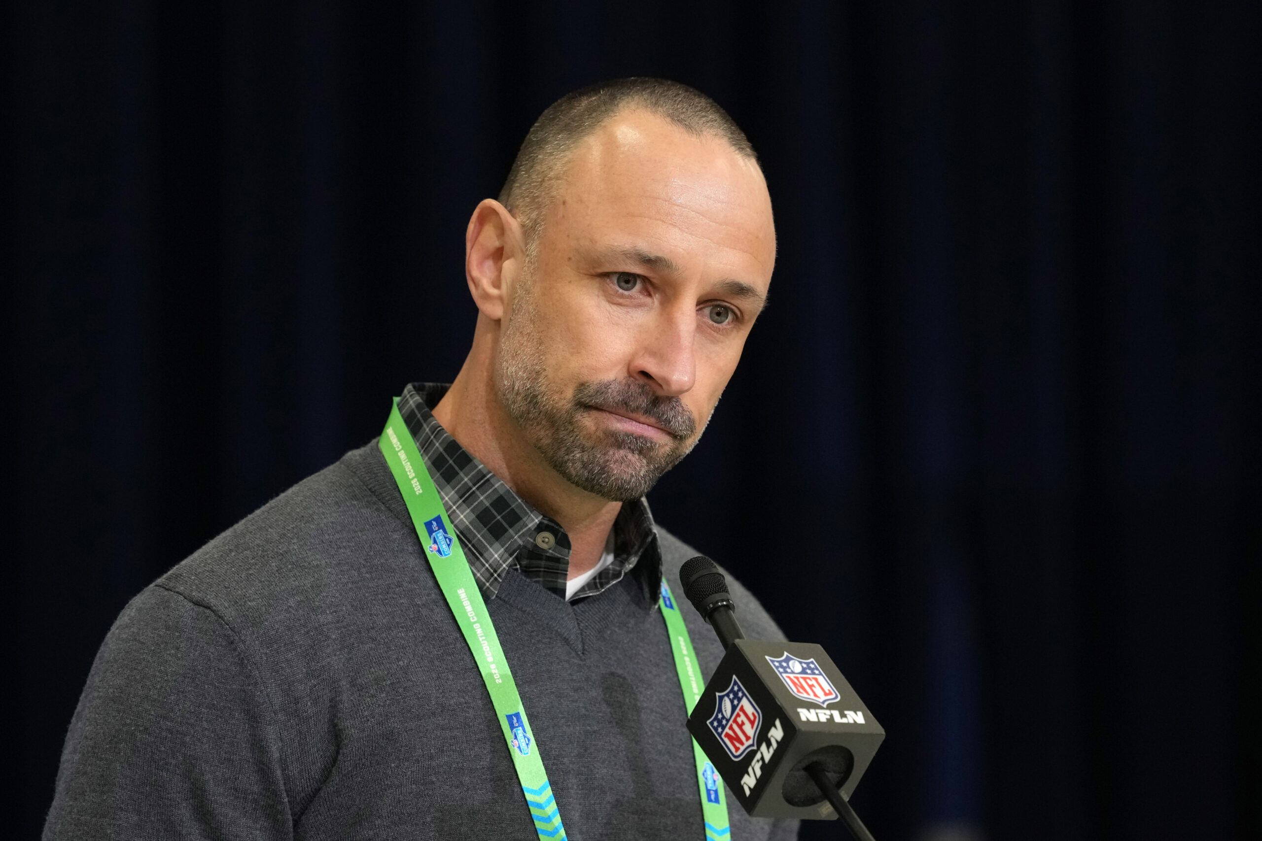 Feb 24, 2026; Indianapolis, IN, USA; Miami Dolphins general manager Jon-Eric Sullivan speaks at the NFL Scouting Combine at the Indiana Convention Center. Mandatory Credit: Kirby Lee-Imagn Images
