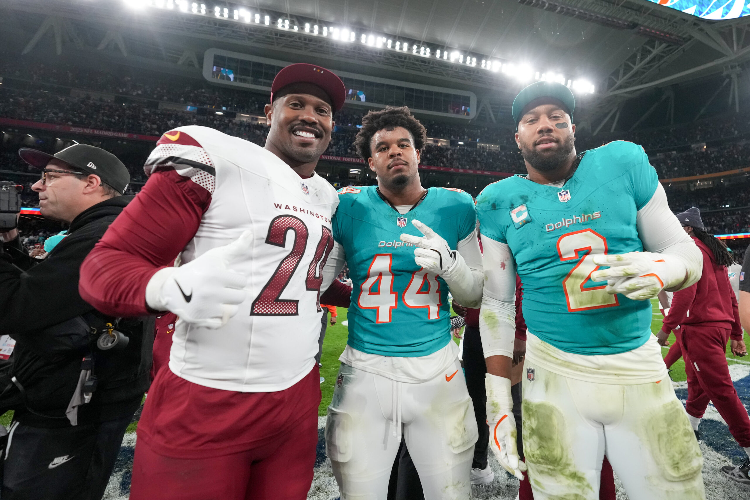 Nov 16, 2025; Madrid, Spain; Washington Commanders linebacker Von Miller (24) poses with Miami Dolphins linebacker Chop Robinson (44) and linebacker Bradley Chubb (2) after the 2025 NFL Madrid Game at Santiago Bernabeu Stadium. Mandatory Credit: Kirby Lee-Imagn Images
