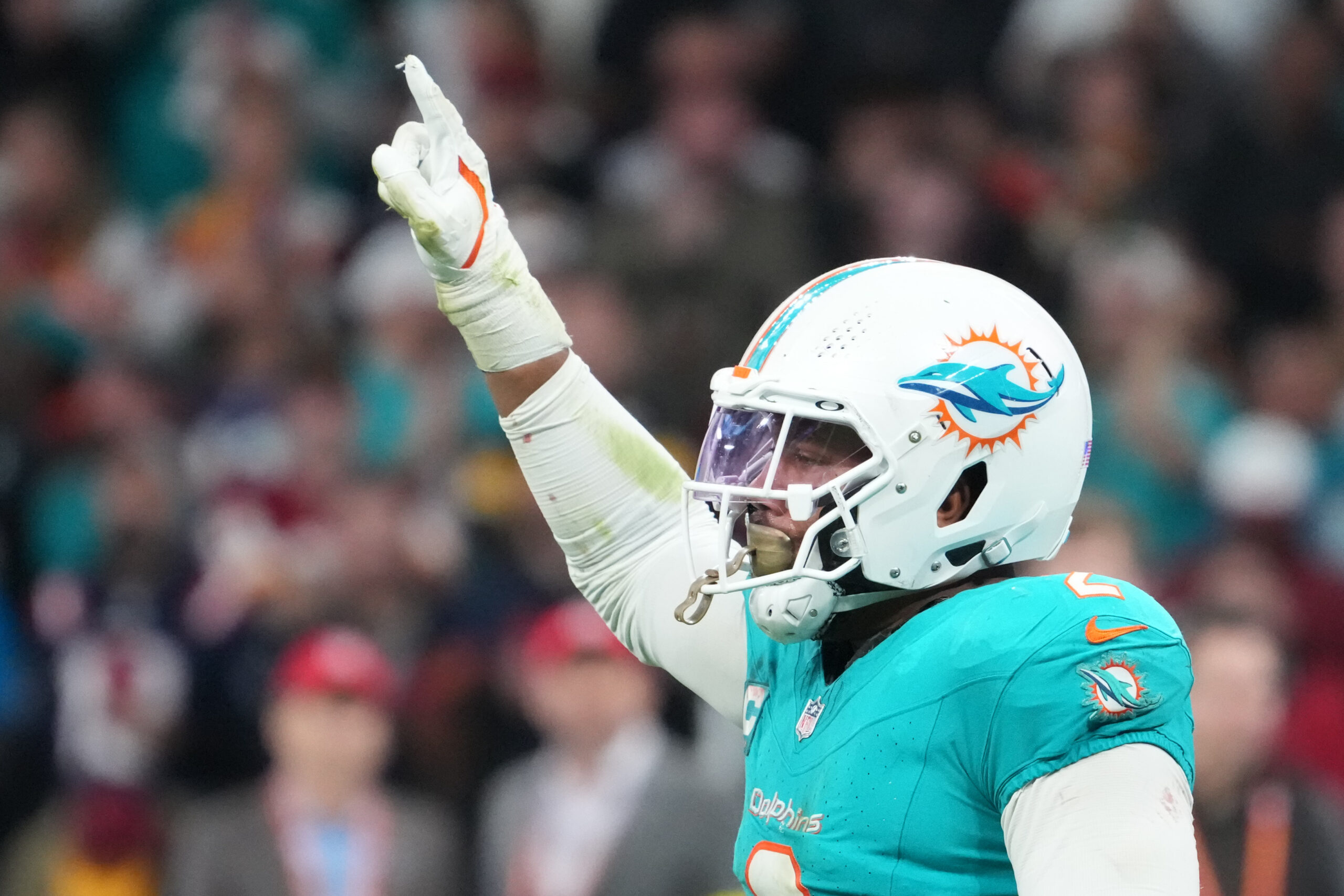 Nov 16, 2025; Madrid, Spain; Miami Dolphins linebacker Bradley Chubb (2) reacts after a play against the Washington Commanders in the fourth quarter during the 2025 NFL Madrid Game at Santiago Bernabeu Stadium. Mandatory Credit: Kirby Lee-Imagn Images