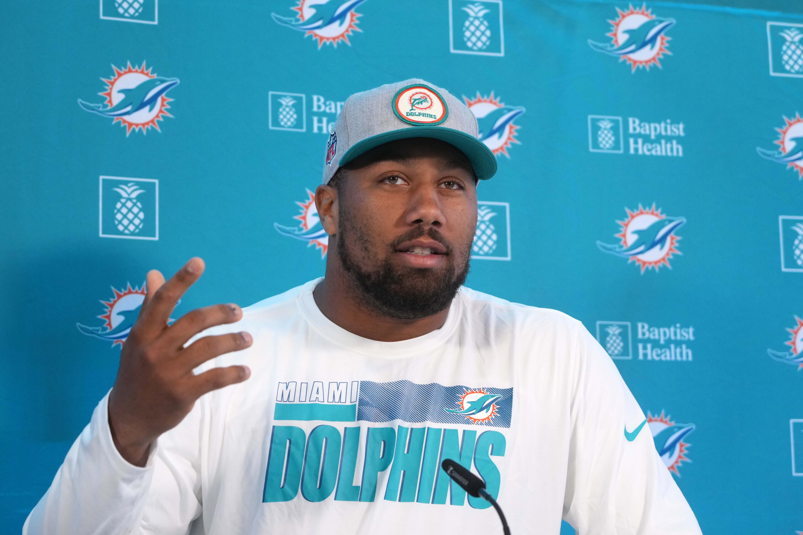 Nov 2, 2023; Frankfurt, Germany; Miami Dolphins linebacker Bradley Chubb at press conference at the PSD Bank Arena. Mandatory Credit: Kirby Lee-Imagn Images