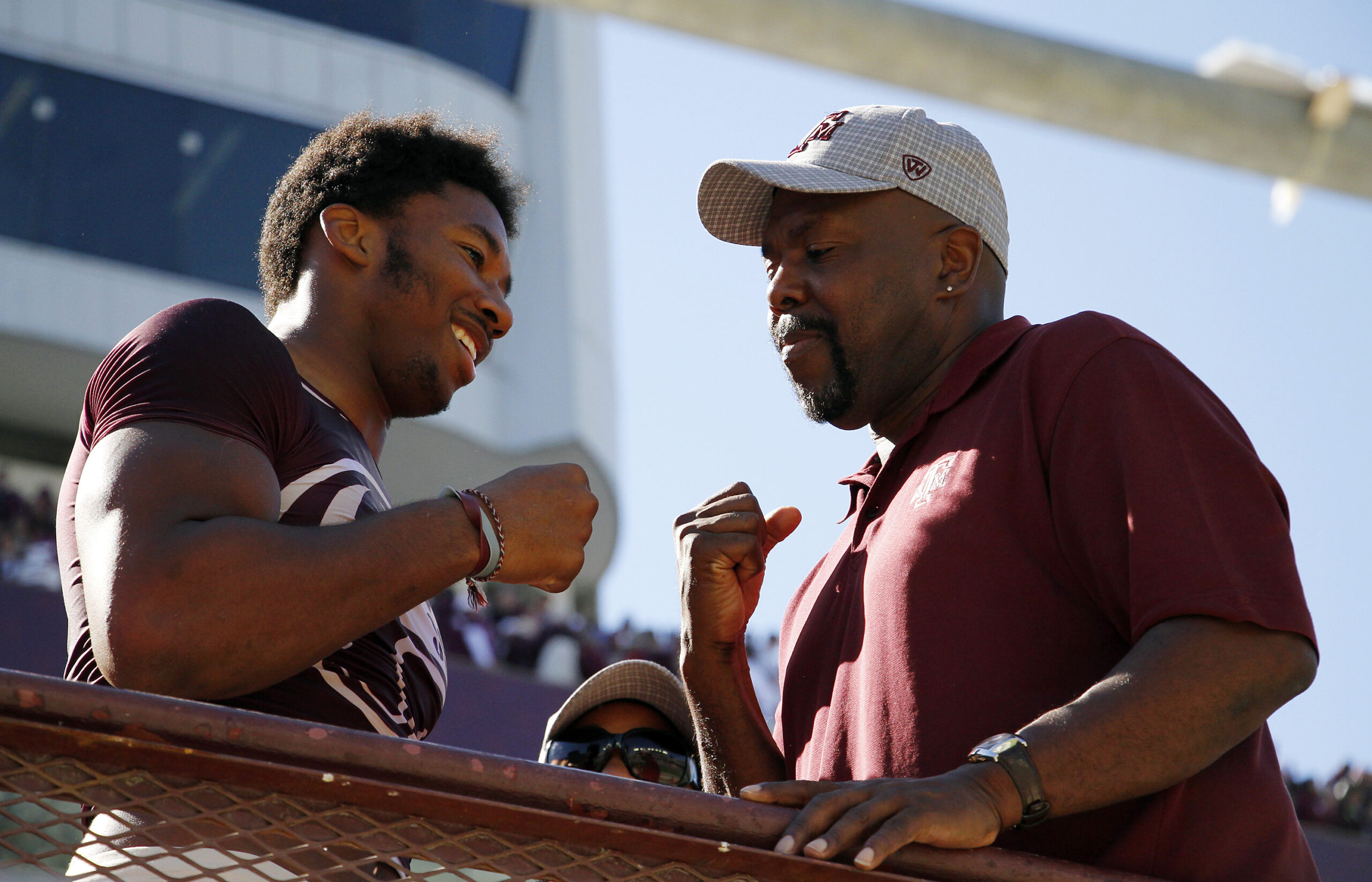Nov 1, 2014; College Station, TX, USA; Texas A&M Aggies defensive lineman Myles Garrett (15) goesin the stands after the game to fist bump his dad after his 3 1/2 sack effort against Louisiana Monroe Warhawks after the game at Kyle Field. Texas A&M Aggies won 21-16. Mandatory Credit: Ray Carlin-Imagn Images