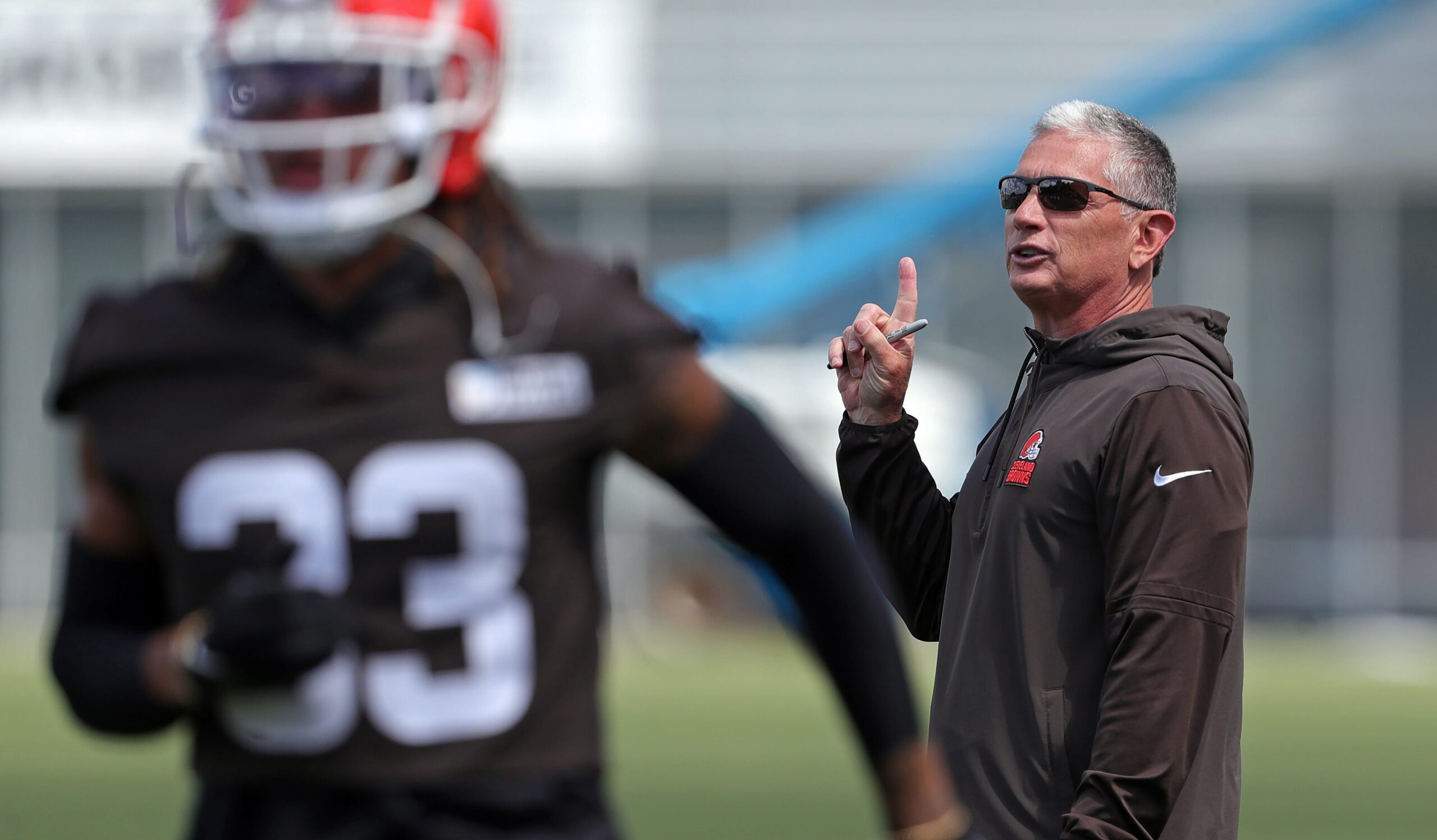 Browns defensive coordinator Jim Schwartz watches the team warm up during minicamp, Tuesday, June 11, 2024, in Berea.-Imagn Images