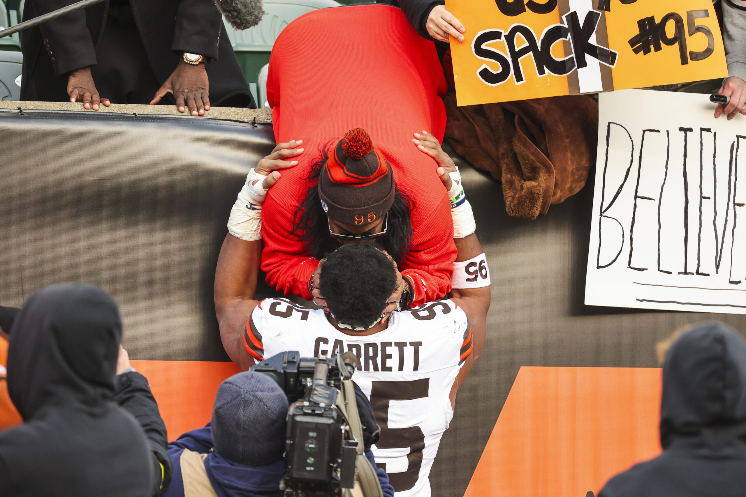 Jan 4, 2026; Cincinnati, Ohio, USA; Cleveland Browns defensive end Myles Garrett (95) greets family following a victory against the Cincinnati Bengals at Paycor Stadium. Mandatory Credit: Joseph Maiorana-Imagn Images