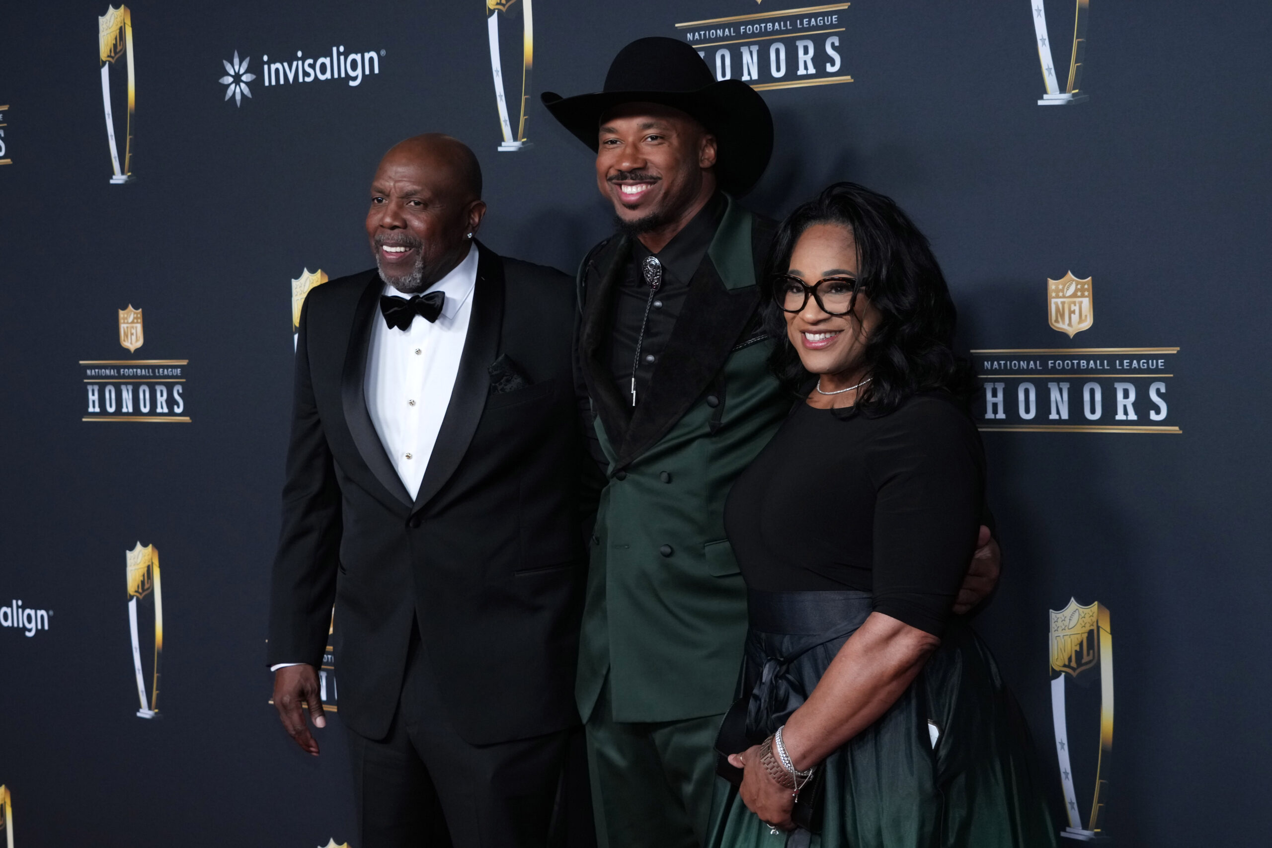 Feb 5, 2026; San Francisco, CA, USA; Myles Garrett (center) poses with father Lawrence Garrett (left) and mother Audrey Garretty on the NFL Honors Red Carpet before Super Bowl LX at Palace of Fine Arts. Mandatory Credit: Kirby Lee-Imagn Images