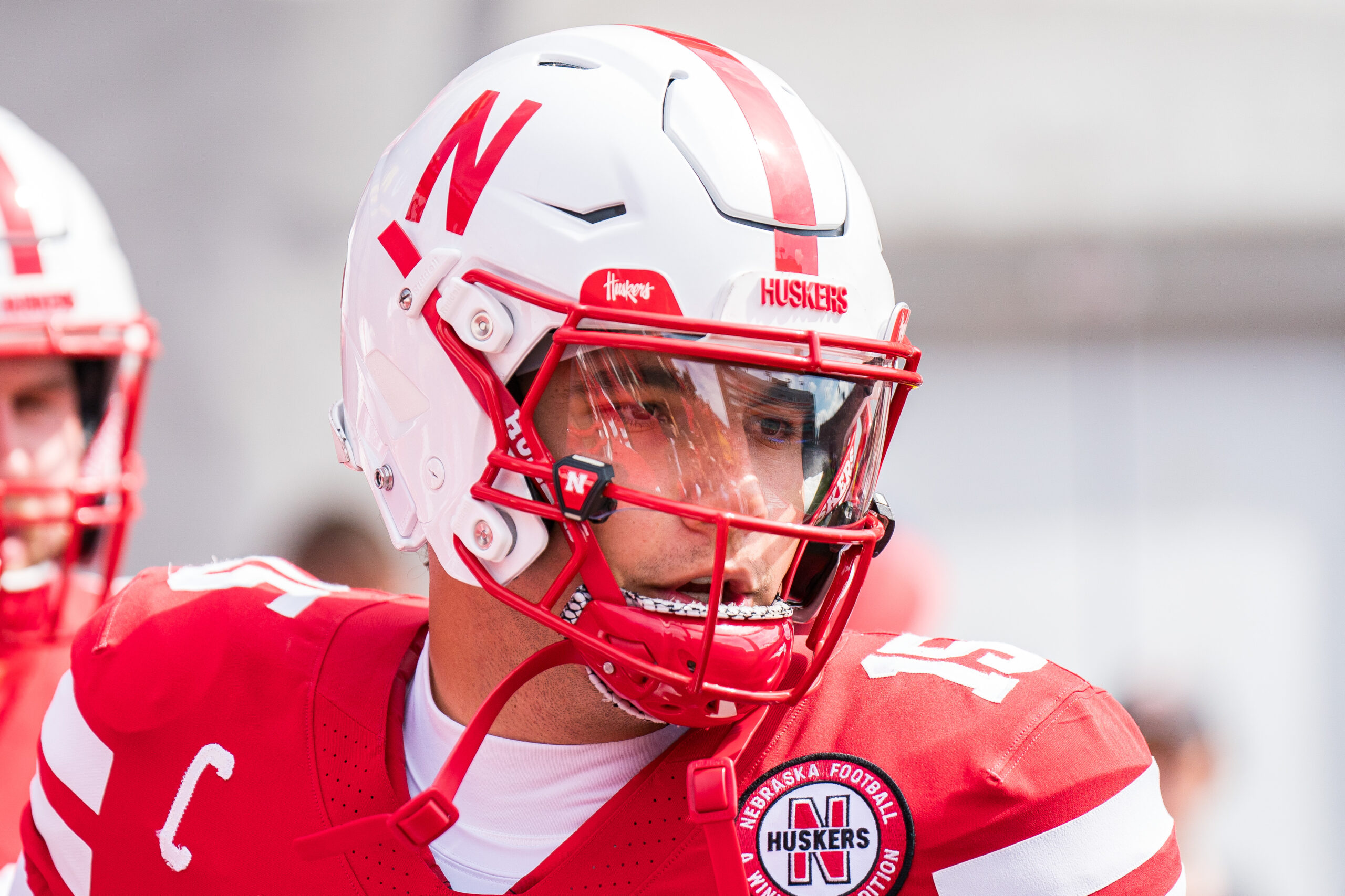 Sep 20, 2025; Lincoln, Nebraska, USA; Nebraska Cornhuskers quarterback Dylan Raiola (15) runs onto the field before the game against the Michigan Wolverines at Memorial Stadium. Mandatory Credit: Dylan Widger-Imagn Images