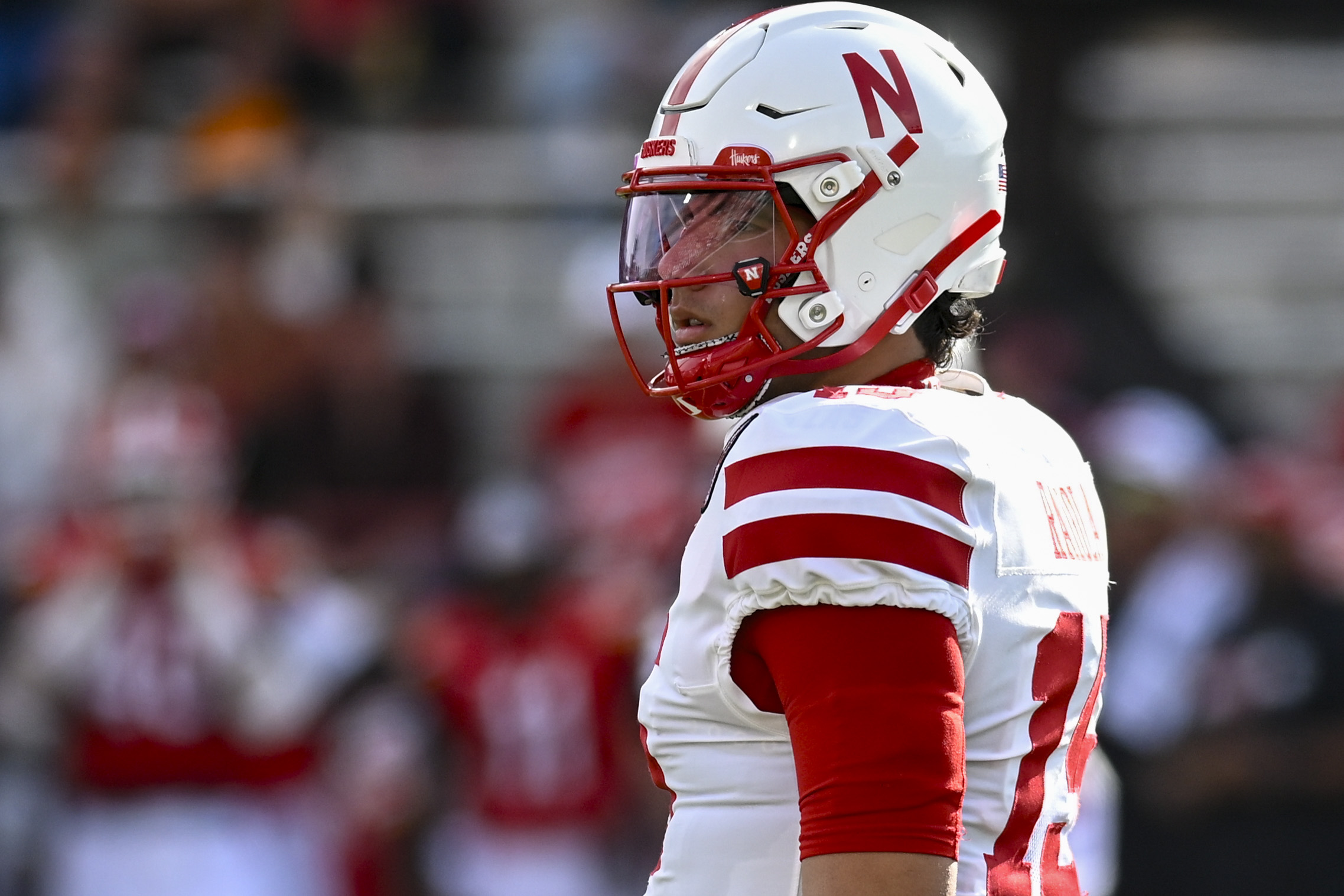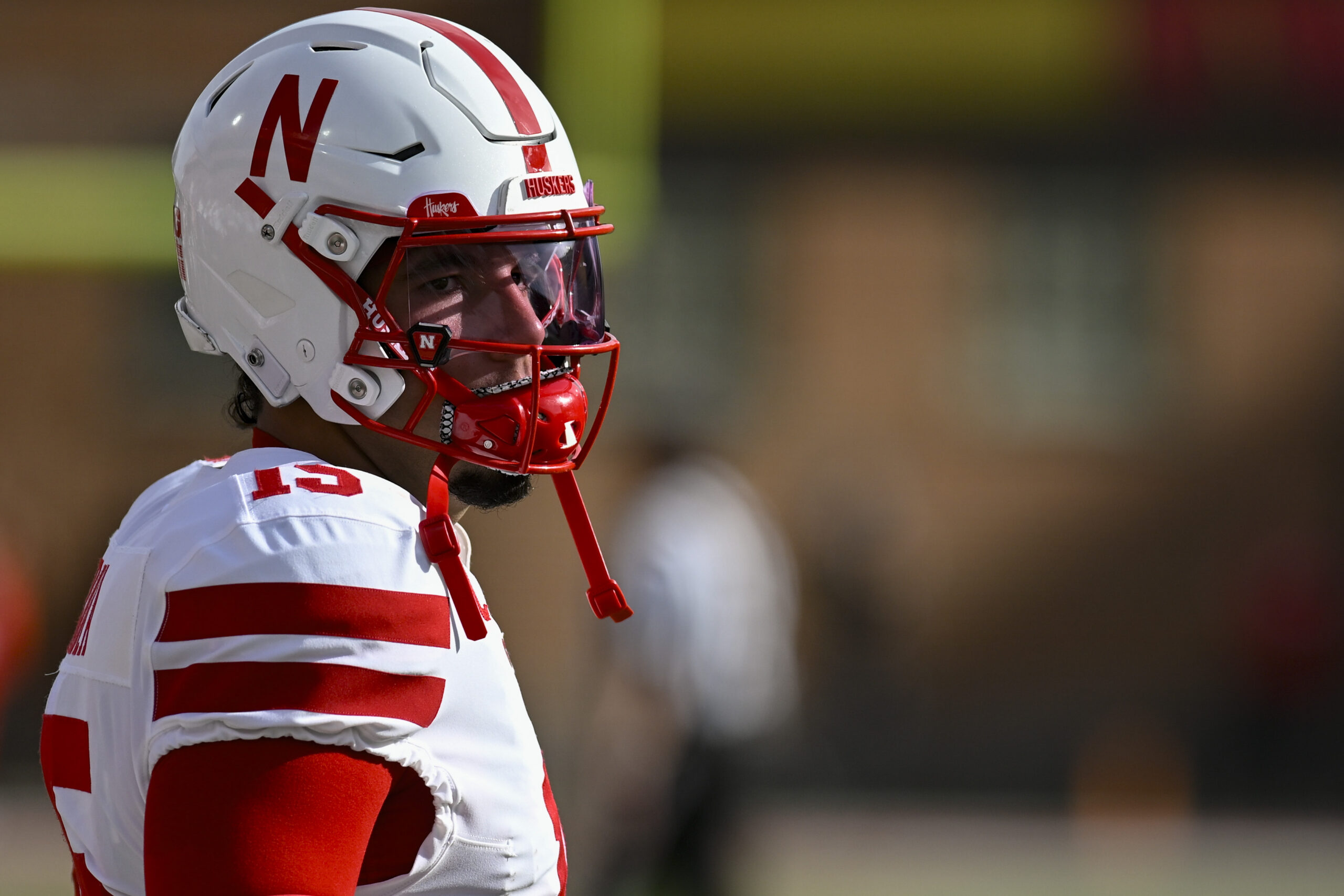 Oct 11, 2025; College Park, Maryland, USA; Nebraska Cornhuskers quarterback Dylan Raiola (15) looks onto the field during the game against the Maryland Terrapins at SECU Stadium. Mandatory Credit: Tommy Gilligan-Imagn Images