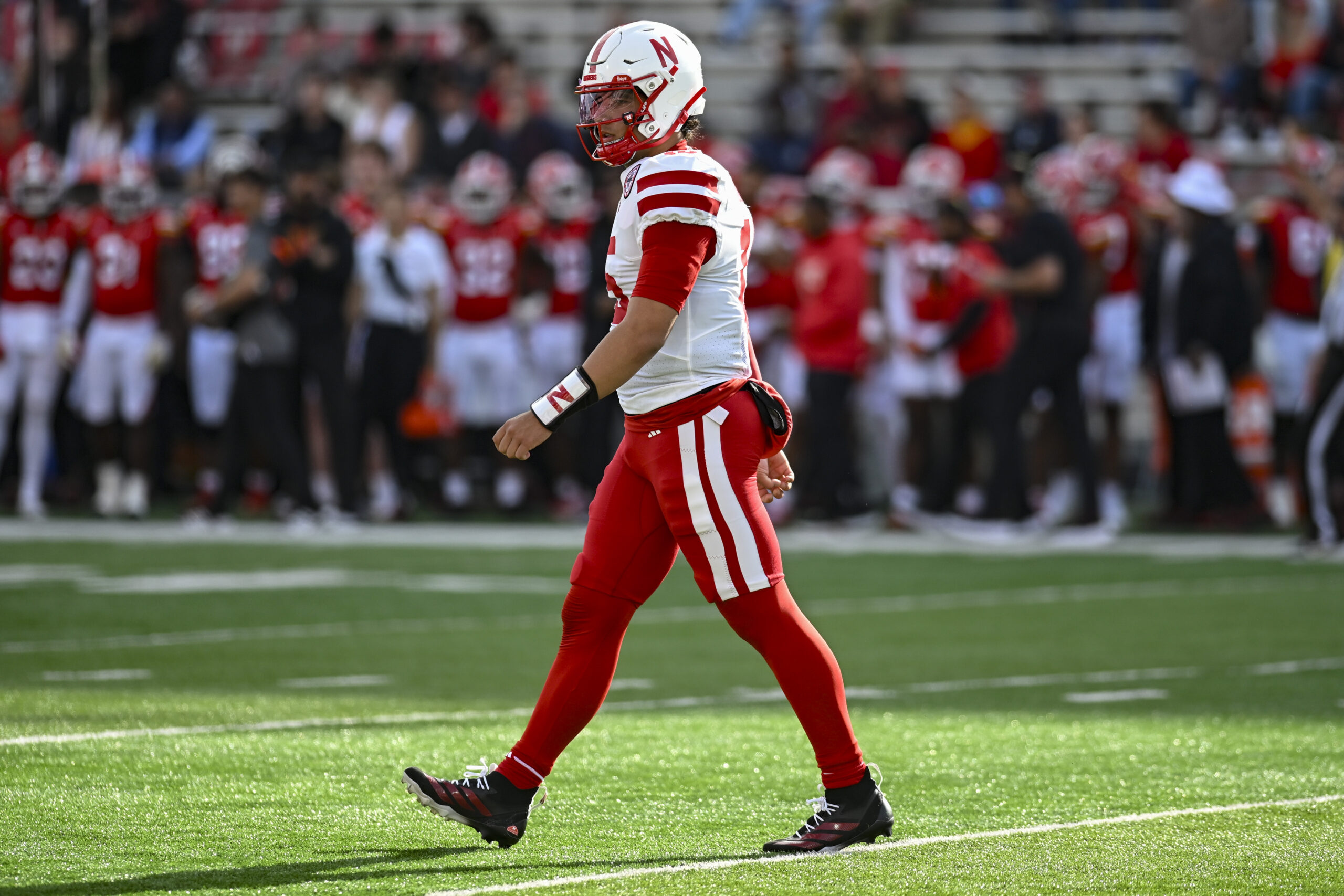Oct 11, 2025; College Park, Maryland, USA; Nebraska Cornhuskers quarterback Dylan Raiola (15) walks across the field during the game against the Maryland Terrapins at SECU Stadium. Mandatory Credit: Tommy Gilligan-Imagn Images