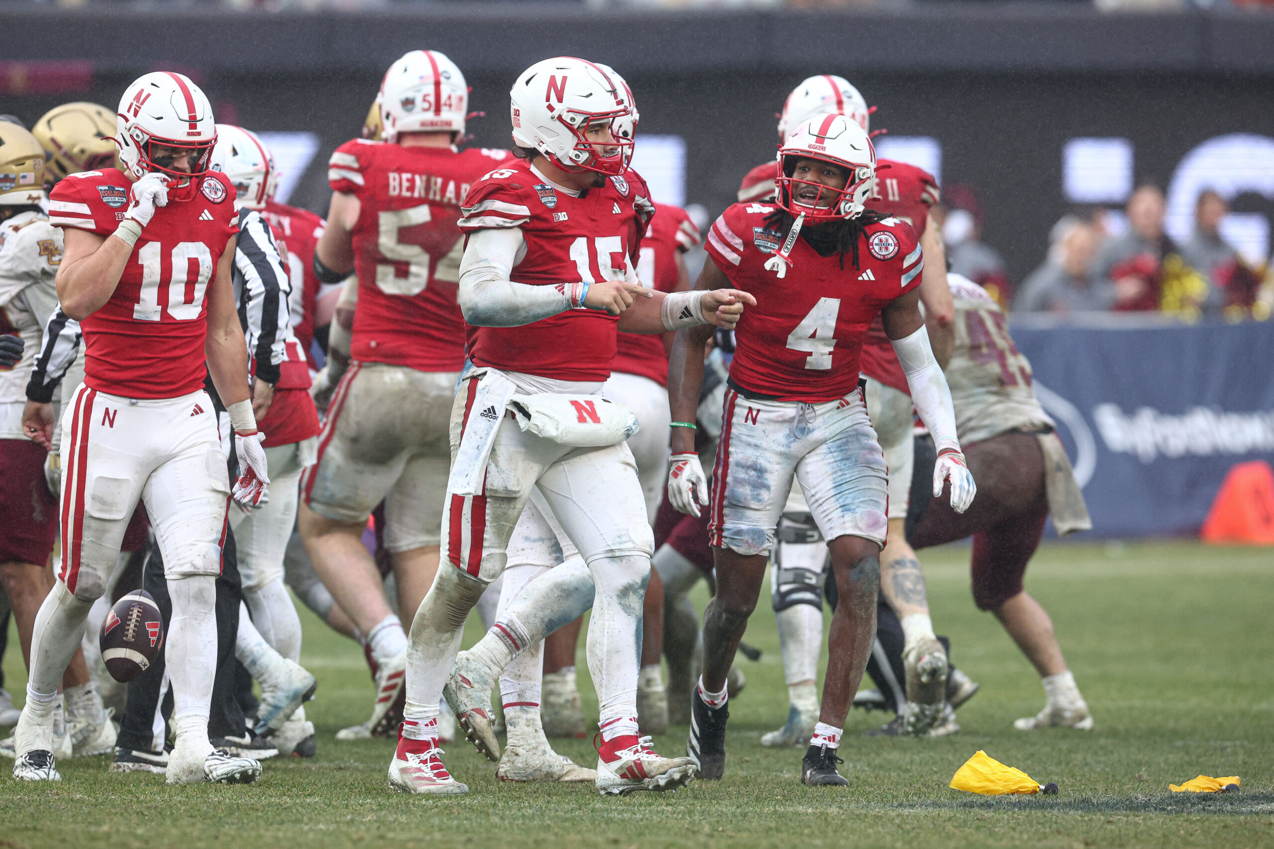 Dec 28, 2024; Bronx, NY, USA; Nebraska Cornhuskers quarterback Dylan Raiola (15) reacts during the second half against the Boston College Eagles at Yankee Stadium. Mandatory Credit: Vincent Carchietta-Imagn Images
