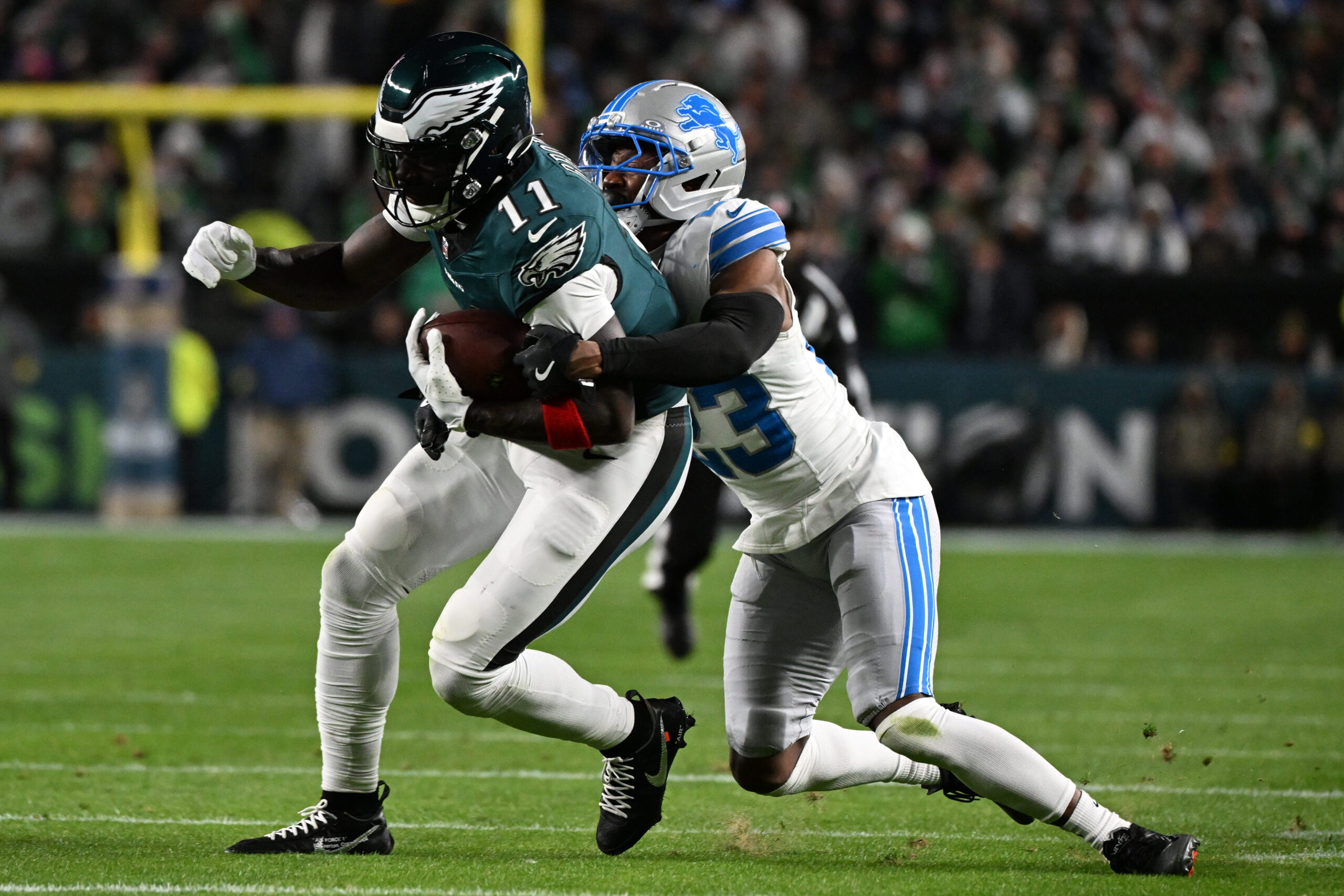 Nov 16, 2025; Philadelphia, Pennsylvania, USA; Philadelphia Eagles wide receiver A.J. Brown (11) makes a catch over Detroit Lions cornerback Rock Ya-Sin (23) during the first half at Lincoln Financial Field. Mandatory Credit: Eric Hartline-Imagn Images