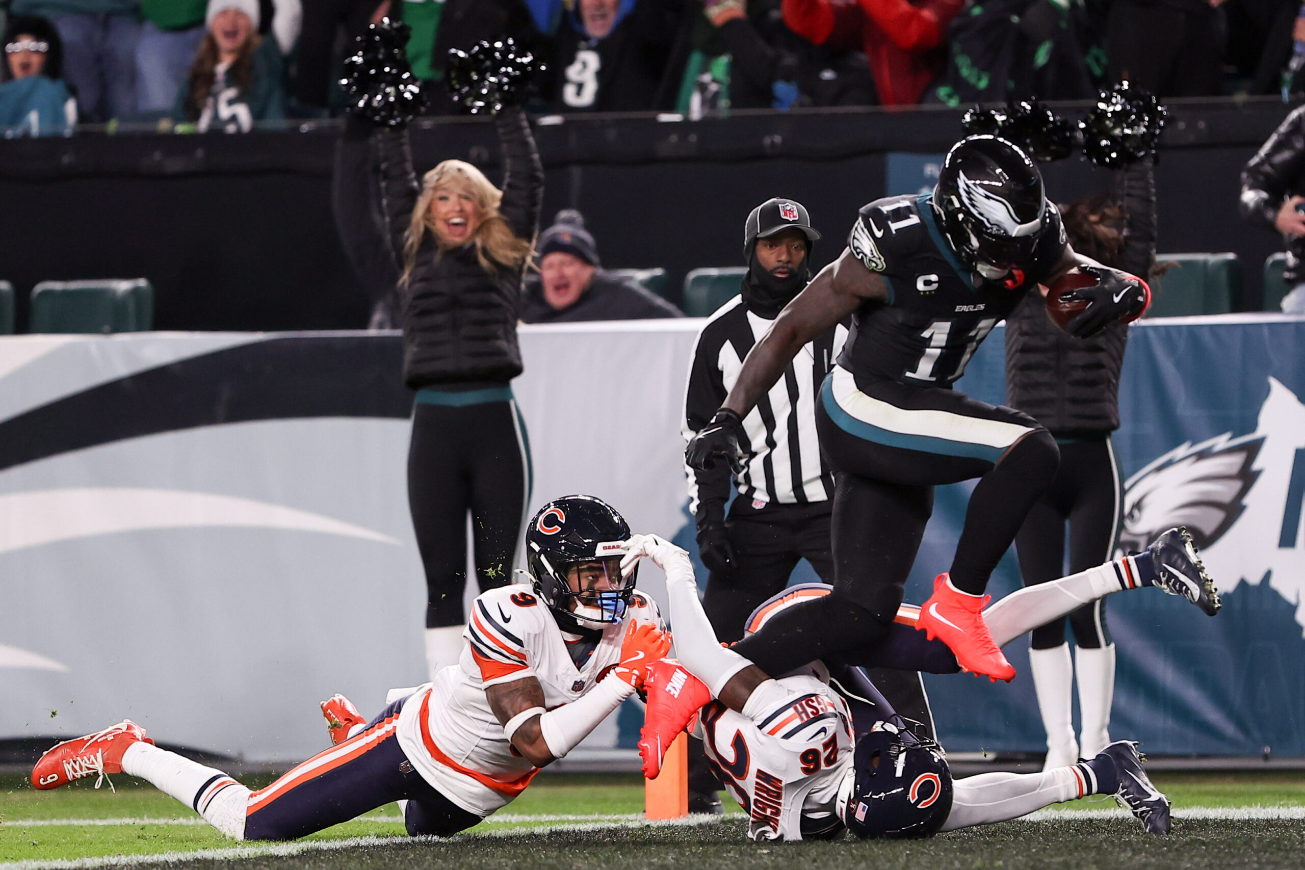 Nov 28, 2025; Philadelphia, Pennsylvania, USA; Philadelphia Eagles wide receiver A.J. Brown (11) scores a touchdown defended by Chicago Bears safety Jaquan Brisker (9) and cornerback Nahshon Wright (26) during the third quarter of the game at Lincoln Financial Field. Mandatory Credit: Bill Streicher-Imagn Images