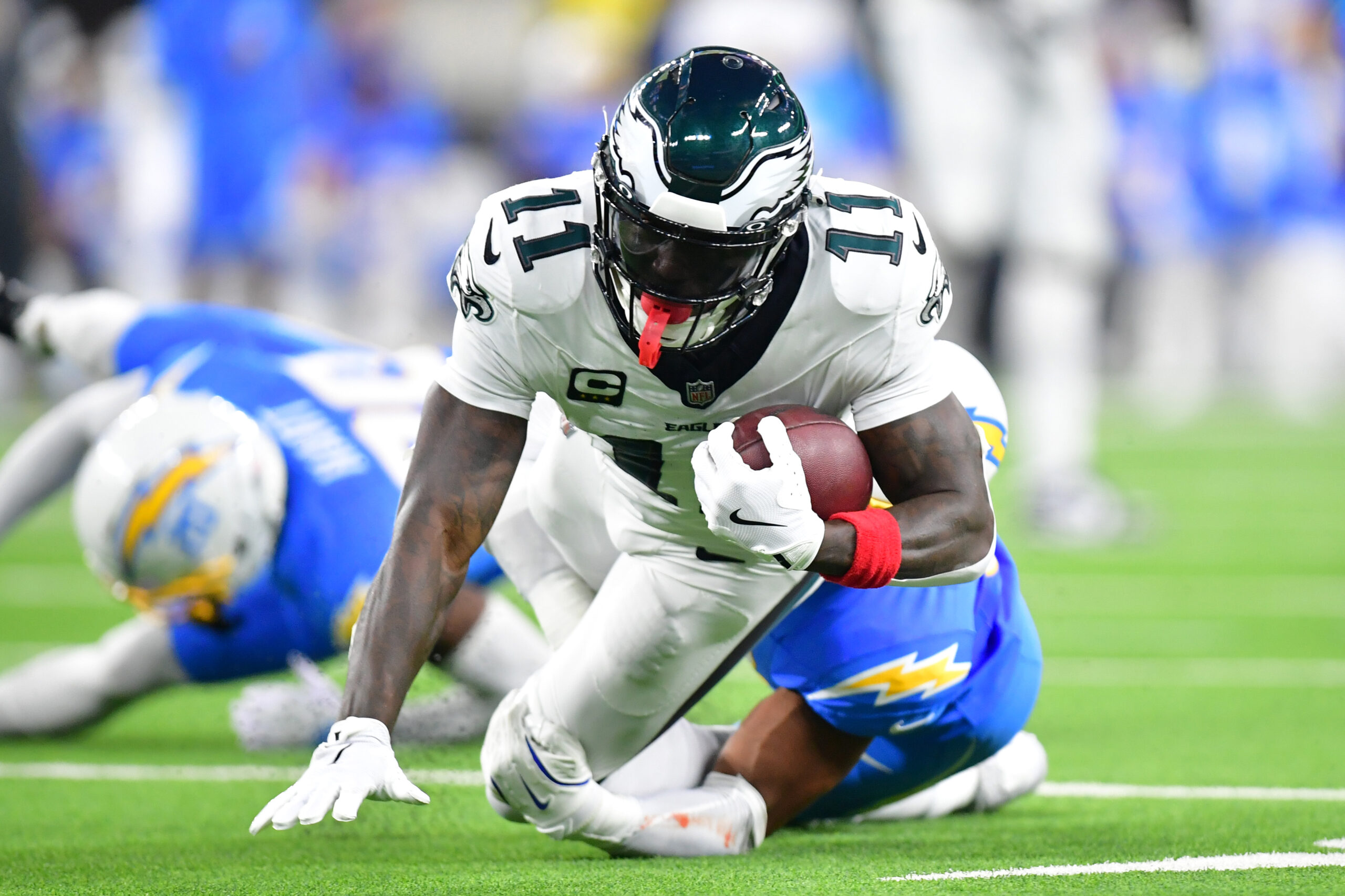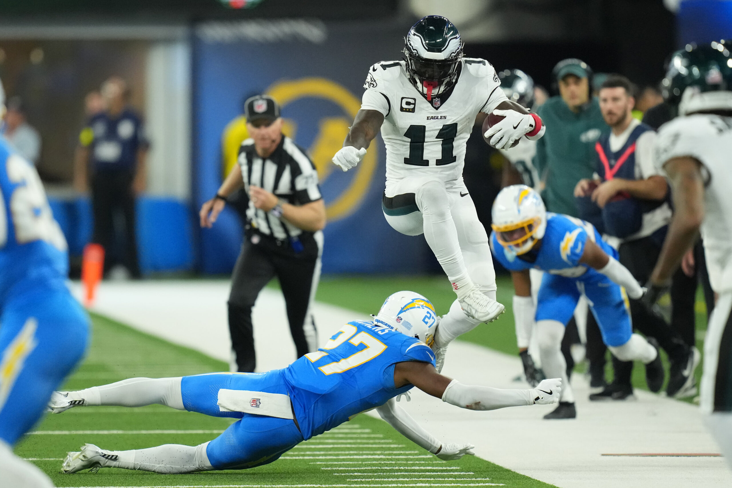 Dec 8, 2025; Inglewood, California, USA; Philadelphia Eagles wide receiver A.J. Brown (11) runs against Los Angeles Chargers linebacker Daiyan Henley (0) in the first half at SoFi Stadium. Mandatory Credit: Gary A. Vasquez-Imagn Images