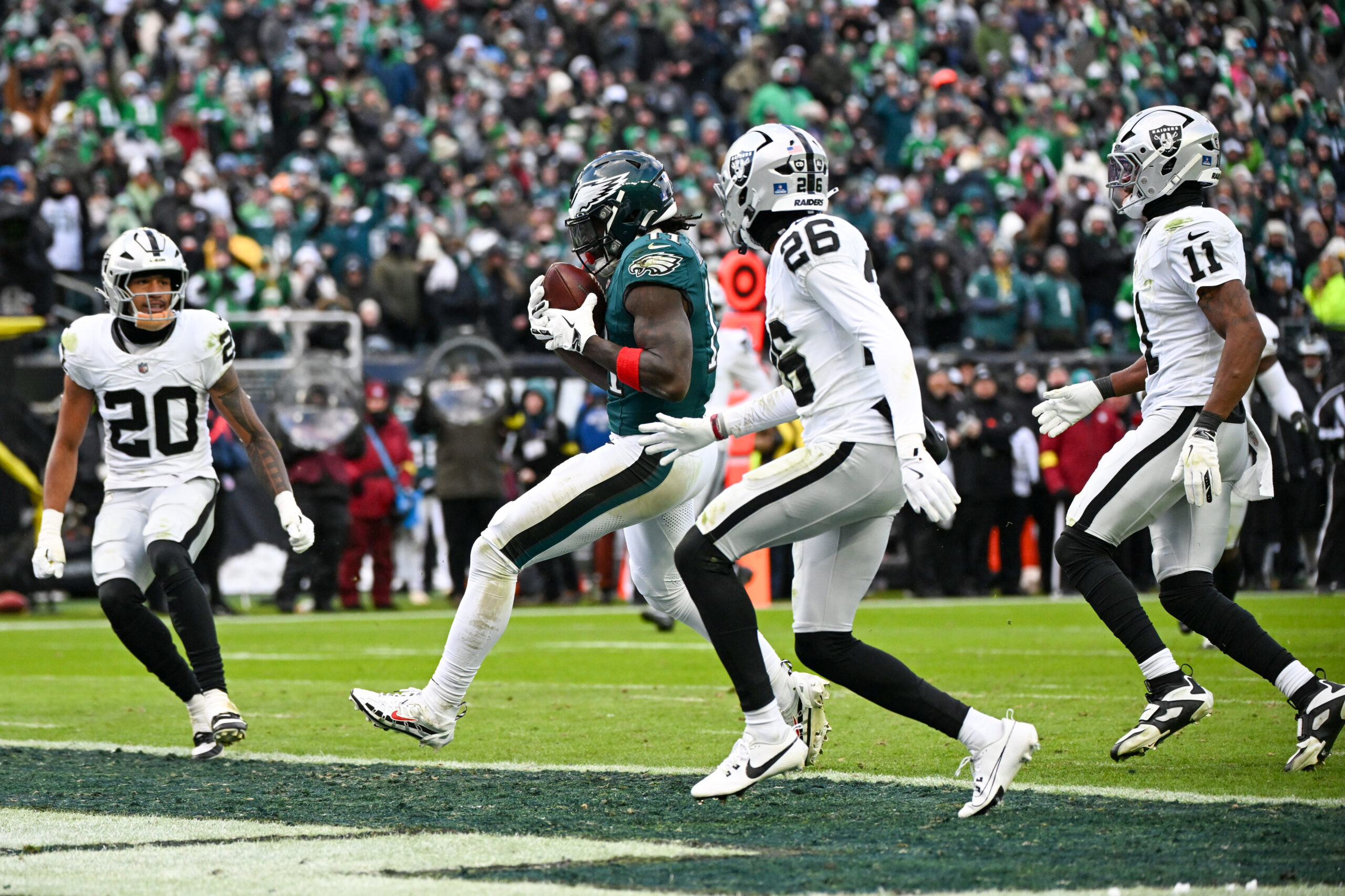 Dec 14, 2025; Philadelphia, Pennsylvania, USA; Philadelphia Eagles wide receiver A.J. Brown (11) catches the ball for a touchdown during the third quarter against the Las Vegas Raiders at Lincoln Financial Field. Mandatory Credit: Eric Hartline-Imagn Images