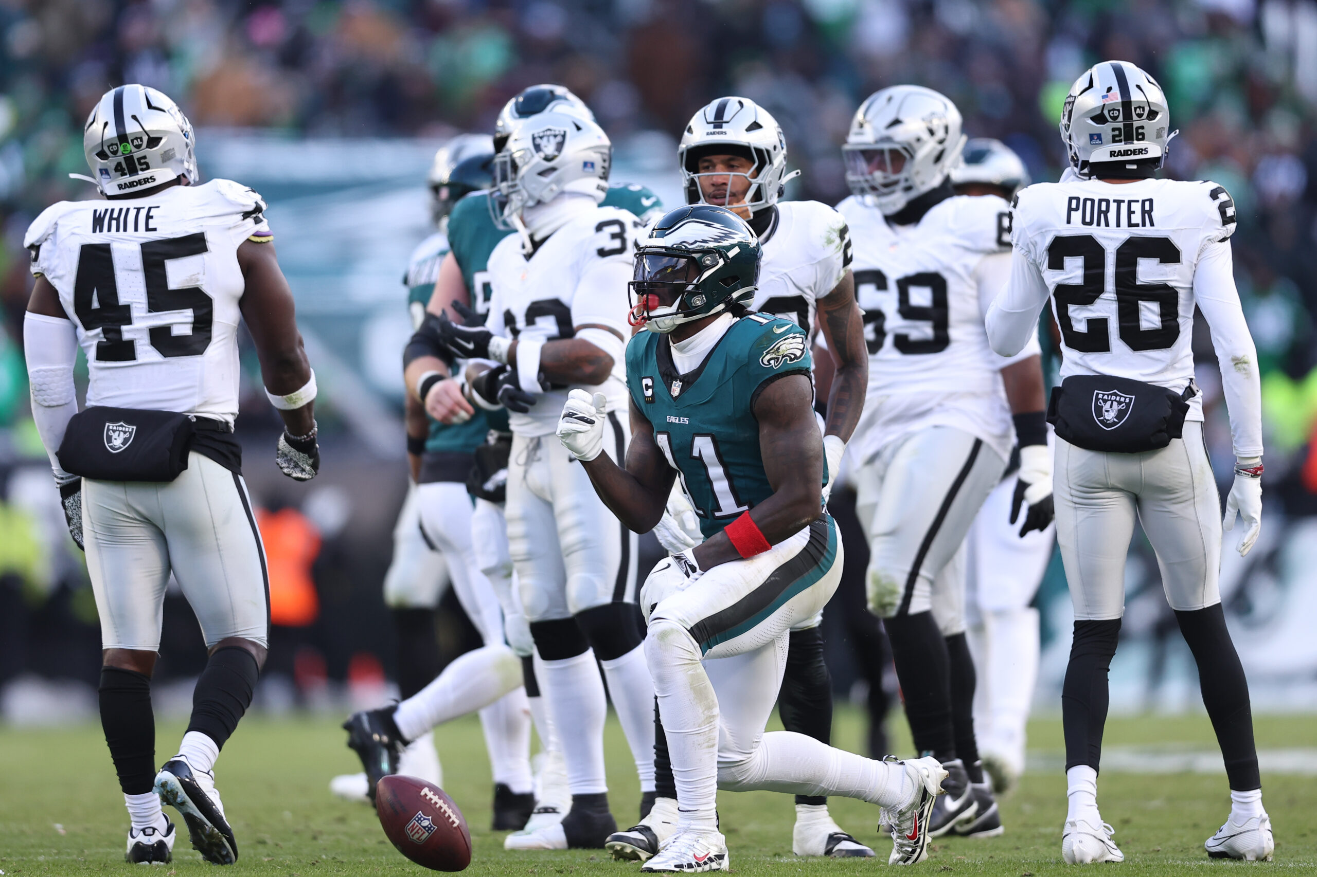 Dec 14, 2025; Philadelphia, Pennsylvania, USA; Philadelphia Eagles wide receiver A.J. Brown (11) reacts after running the ball for a first down against the Las Vegas Raiders during the third quarter at Lincoln Financial Field. Mandatory Credit: Bill Streicher-Imagn Images
