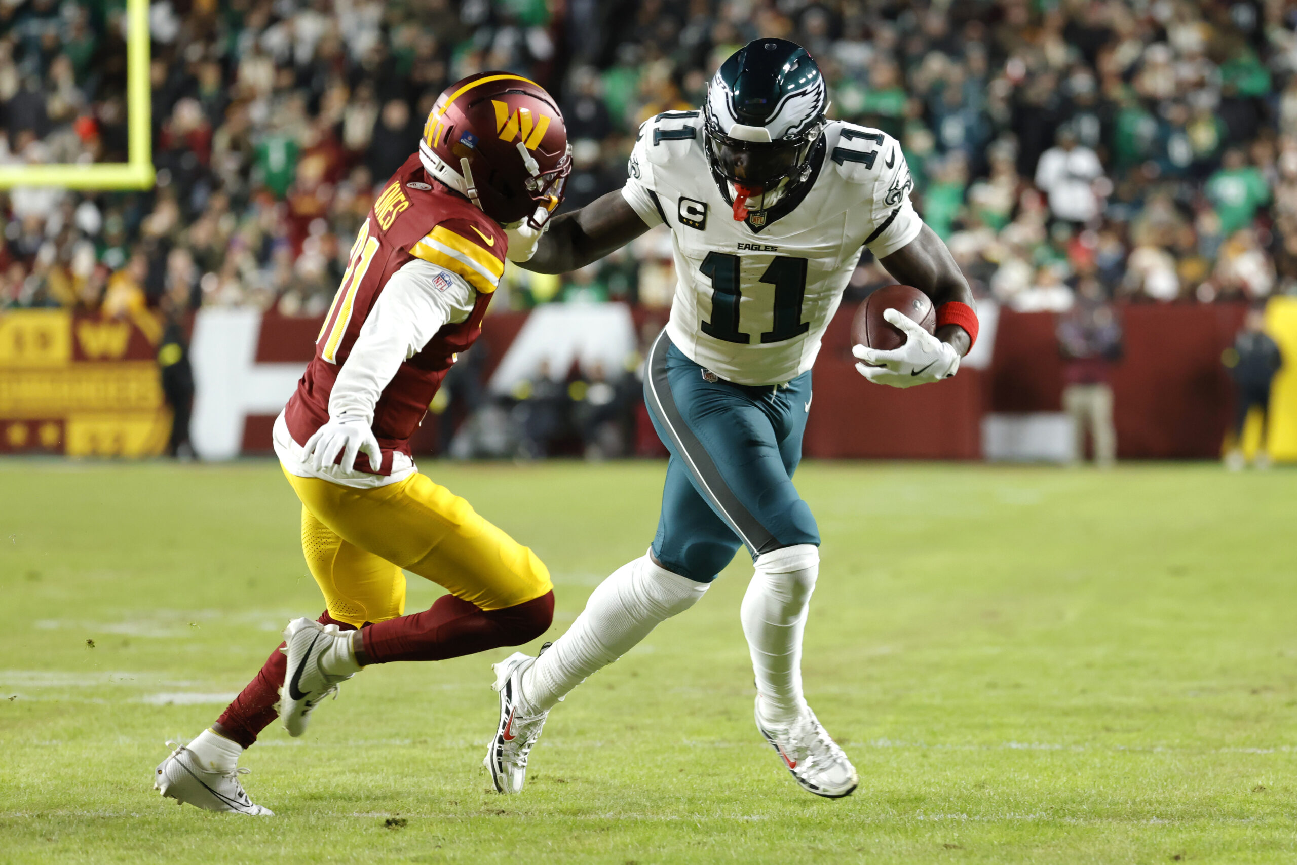 Dec 20, 2025; Landover, Maryland, USA; Philadelphia Eagles wide receiver A.J. Brown (11) runs against Washington Commanders cornerback Jonathan Jones (31) during the first half at Northwest Stadium. Mandatory Credit: Amber Searls-Imagn Images