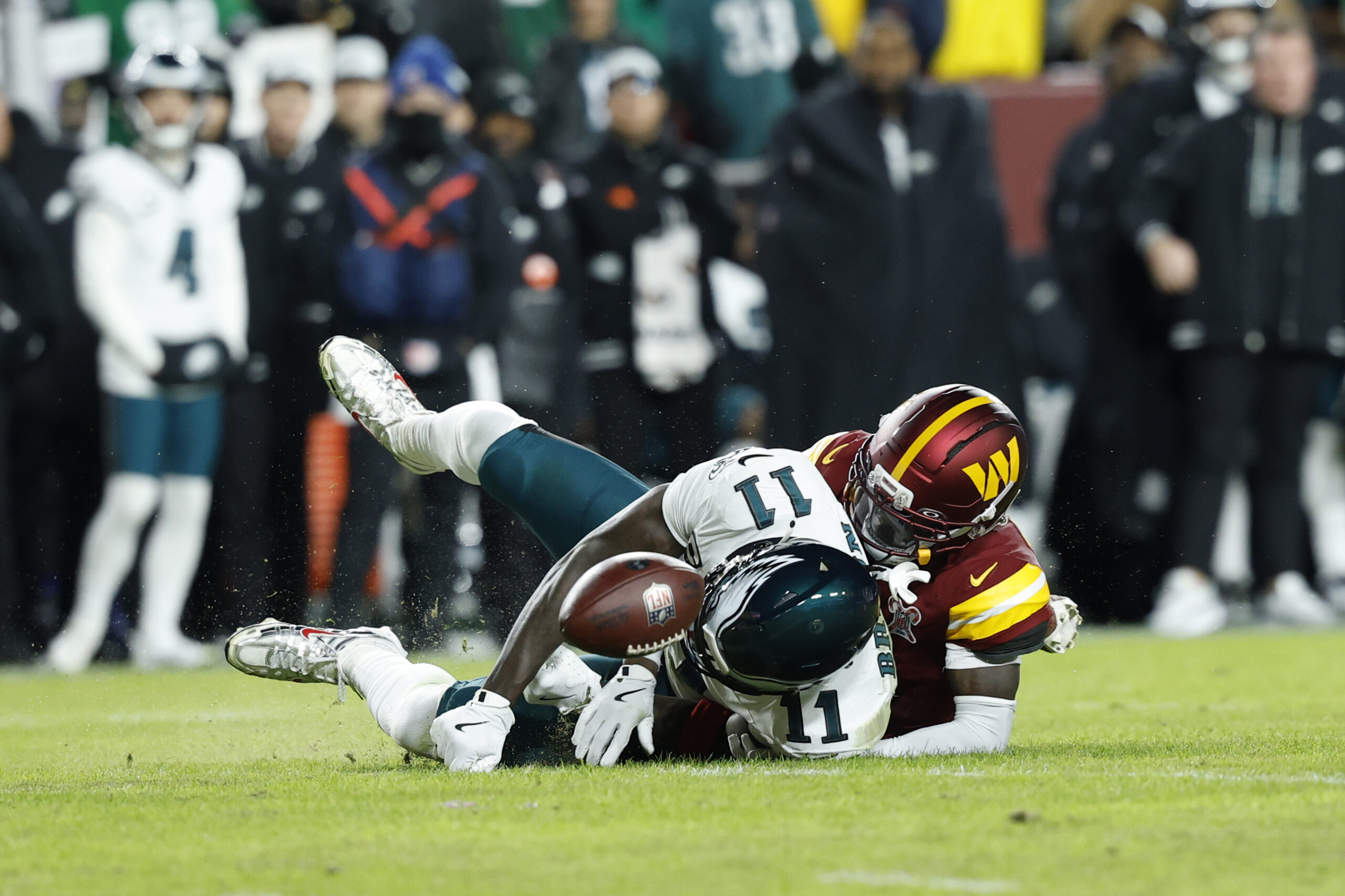 Dec 20, 2025; Landover, Maryland, USA; Washington Commanders cornerback Mike Sainristil (0) breaks up a pass intended for Philadelphia Eagles wide receiver A.J. Brown (11) in the first half at Northwest Stadium. Mandatory Credit: Geoff Burke-Imagn Images