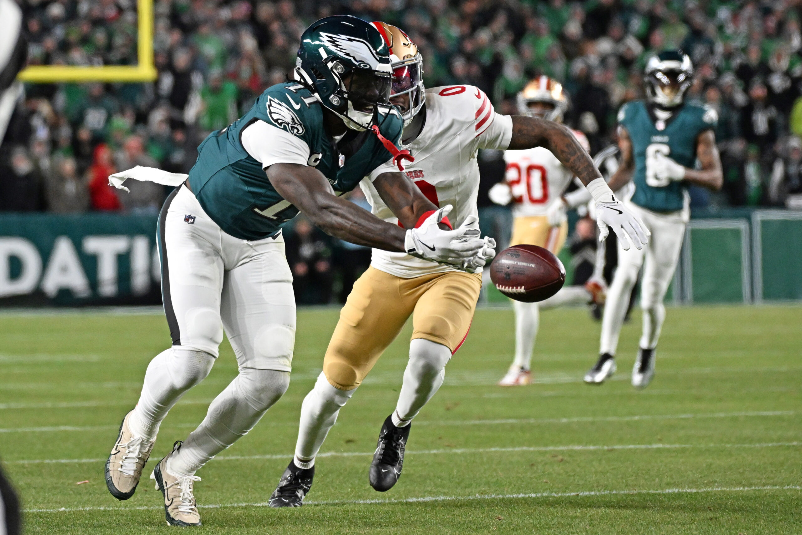 Jan 11, 2026; Philadelphia, PA, USA; Philadelphia Eagles wide receiver A.J. Brown (11) doesn’t make catch while being defended by San Francisco 49ers cornerback Renardo Green (0) during the second quarter in an NFC Wild Card Round game at Lincoln Financial Field. Mandatory Credit: Eric Hartline-Imagn Images