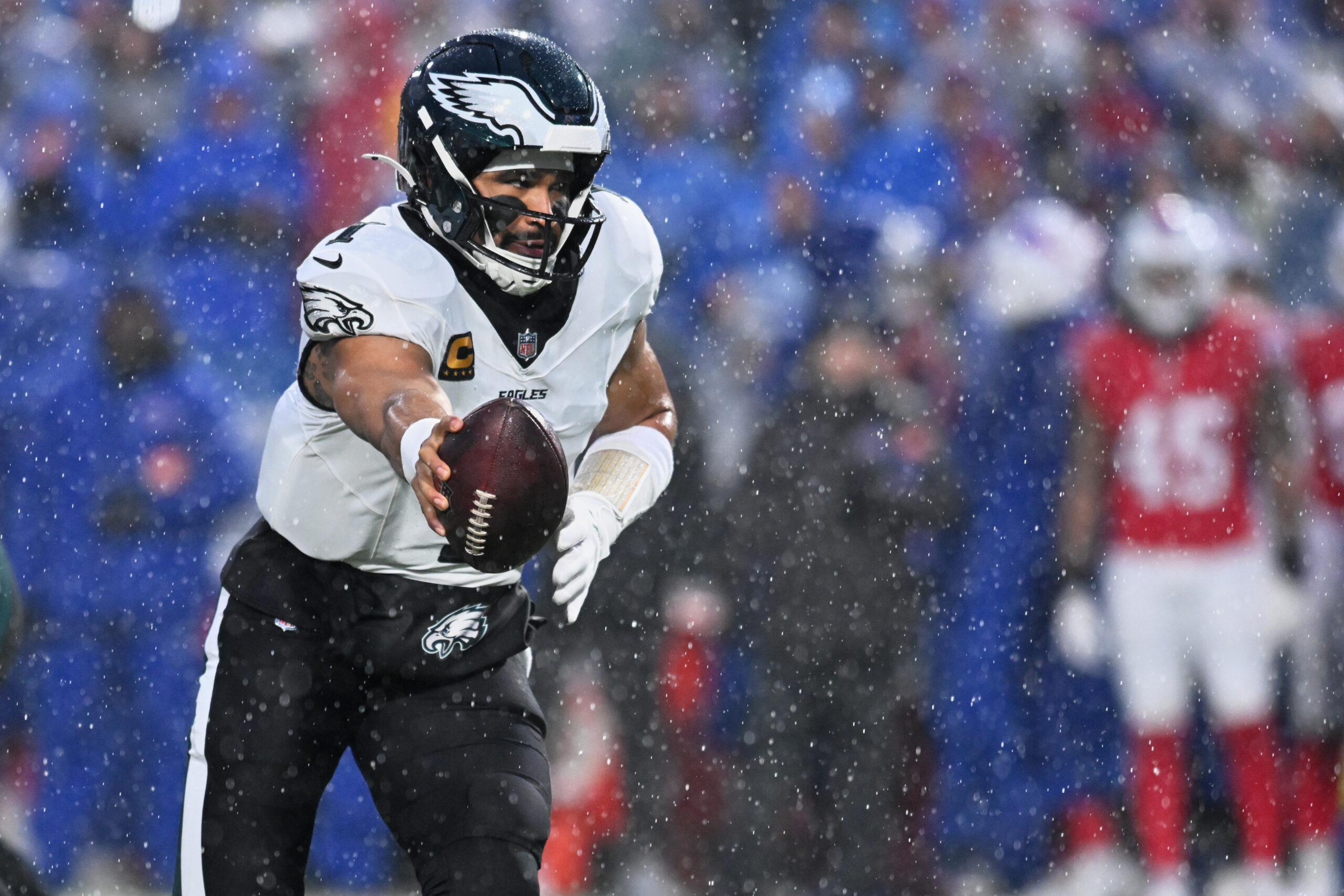 Dec 28, 2025; Orchard Park, New York, USA; Philadelphia Eagles quarterback Jalen Hurts (1) prepares to hand the ball off against the Buffalo Bills during the first quarter at Highmark Stadium. Mandatory Credit: Mark Konezny-Imagn Images