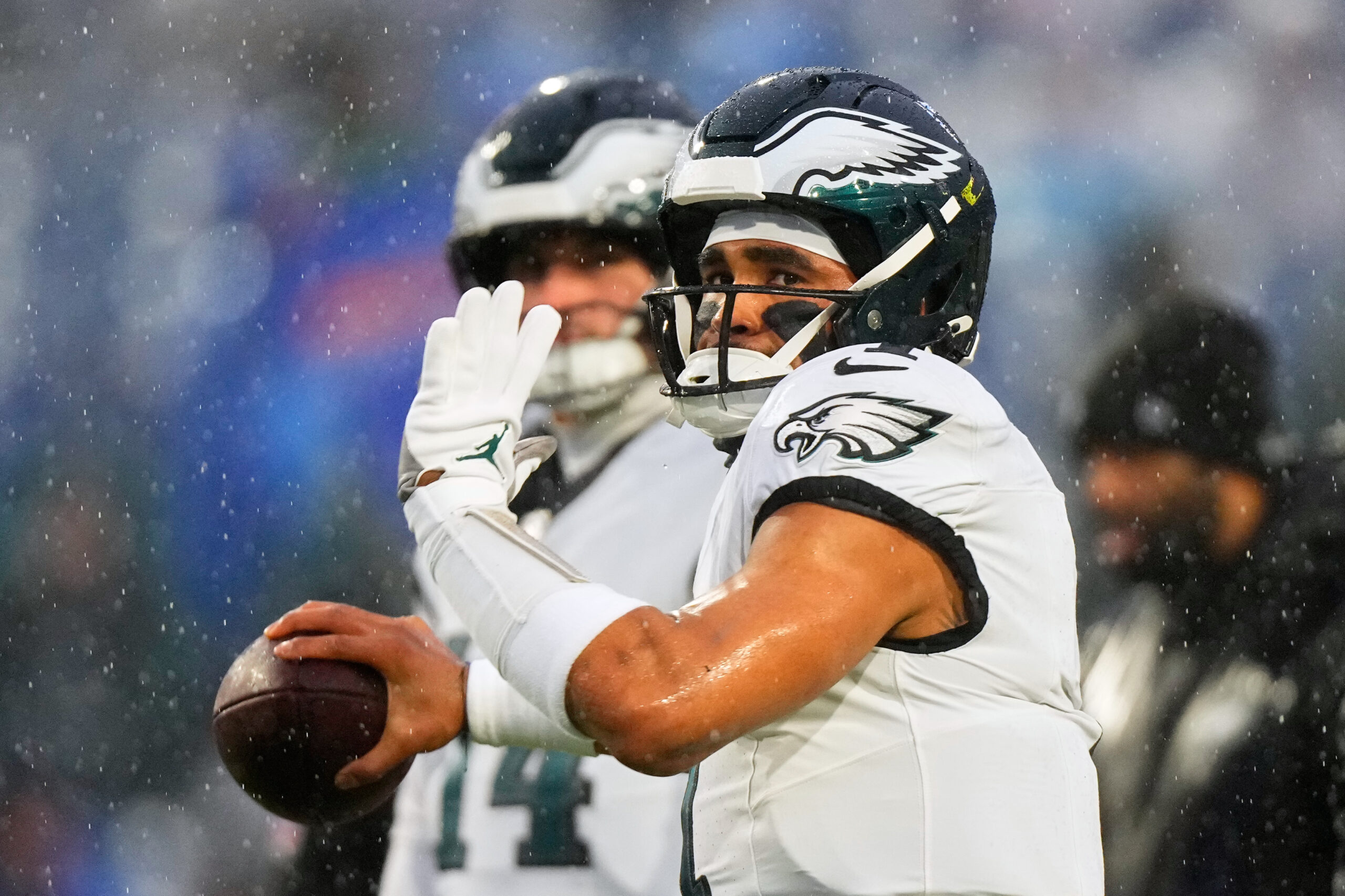Dec 28, 2025; Orchard Park, New York, USA; Philadelphia Eagles quarterback Jalen Hurts (1) warms up in the rain before the game against the Buffalo Bills at Highmark Stadium. Mandatory Credit: Gregory Fisher-Imagn Images