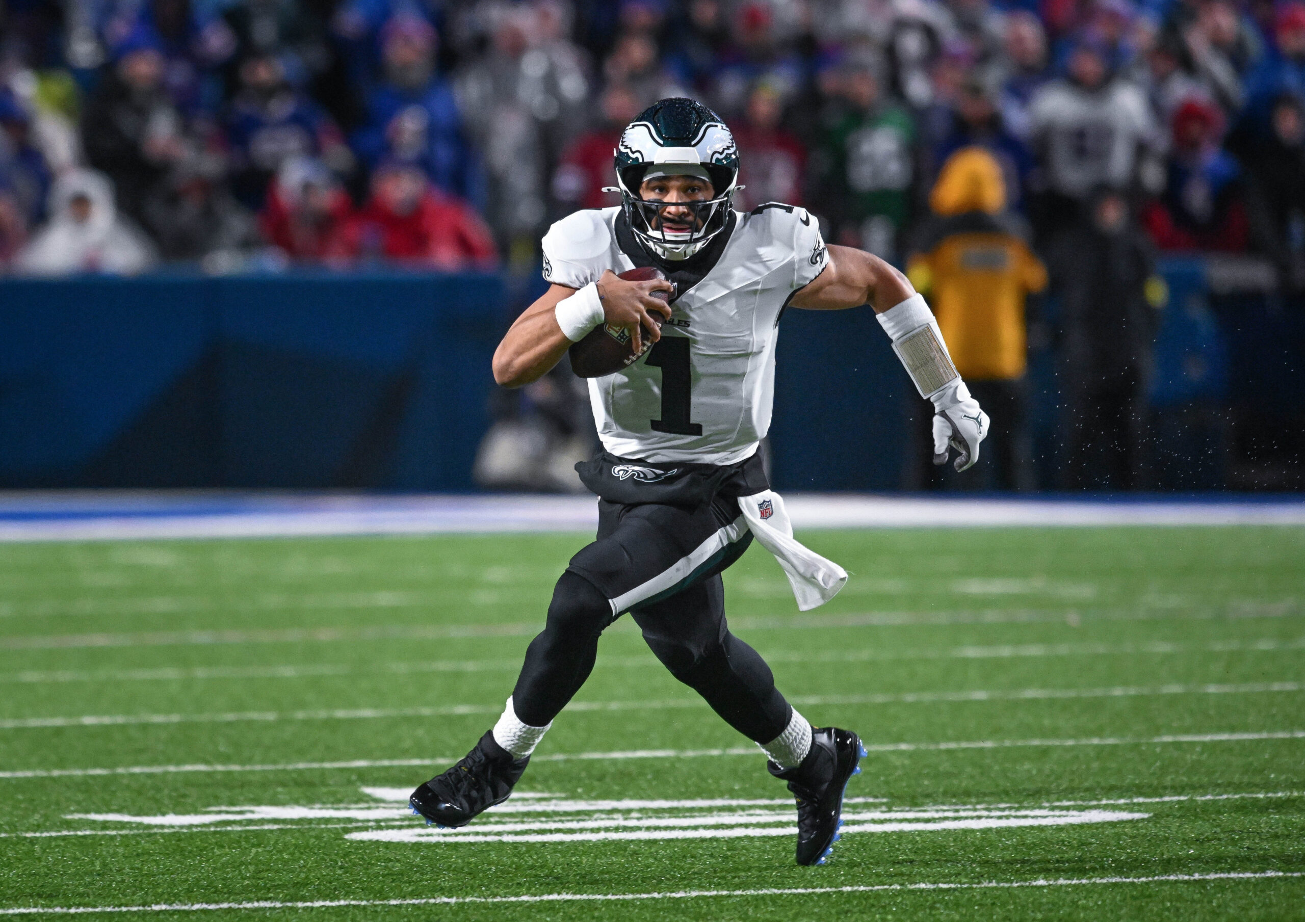Dec 28, 2025; Orchard Park, New York, USA; Philadelphia Eagles quarterback Jalen Hurts (1) runs out of the pocket against the Buffalo Bills in the second quarter at Highmark Stadium. Mandatory Credit: Mark Konezny-Imagn Images
