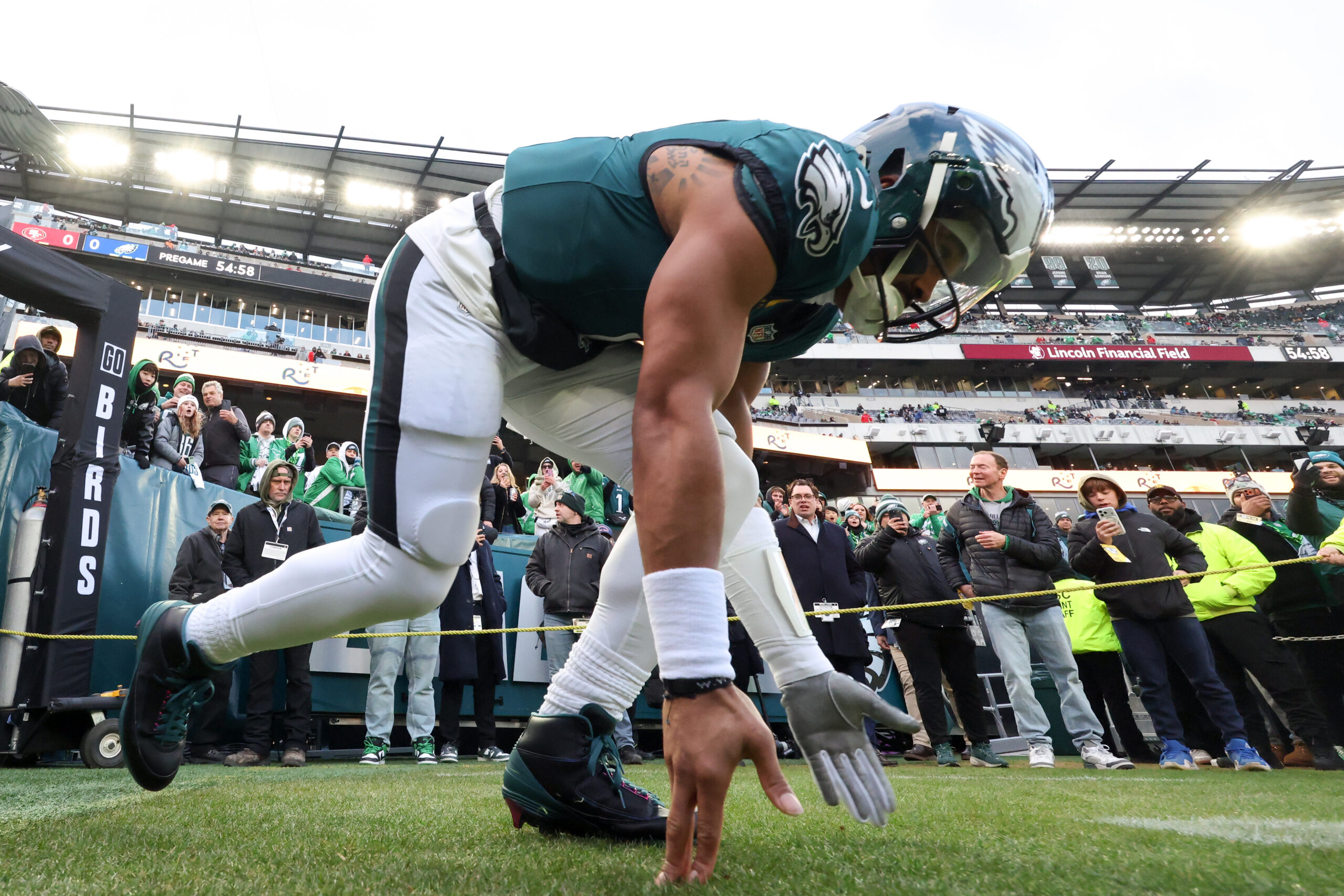 Jan 11, 2026; Philadelphia, PA, USA; Philadelphia Eagles quarterback Jalen Hurts (1) touches the grass as he heads out to the field for warmups prior to an NFC Wild Card Round game against the San Francisco 49ers at Lincoln Financial Field. Mandatory Credit: Bill Streicher-Imagn Images