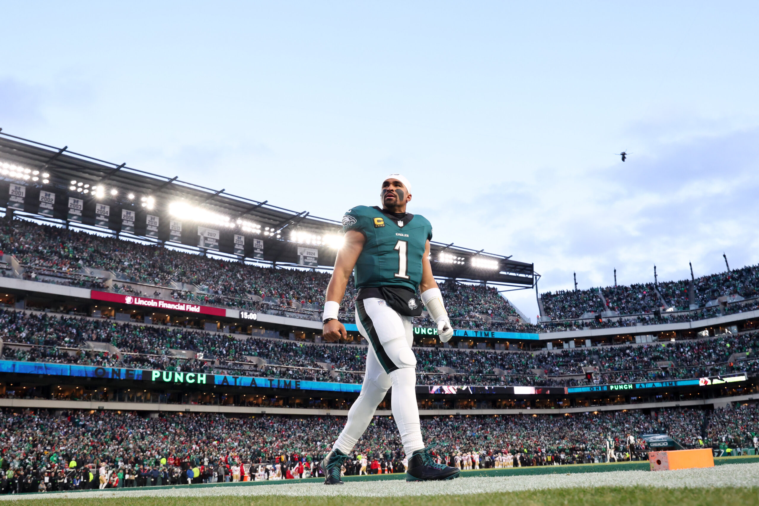 Jan 11, 2026; Philadelphia, PA, USA; Philadelphia Eagles quarterback Jalen Hurts (1) looks on prior to an NFC Wild Card Round game against the San Francisco 49ers at Lincoln Financial Field. Mandatory Credit: Bill Streicher-Imagn Images