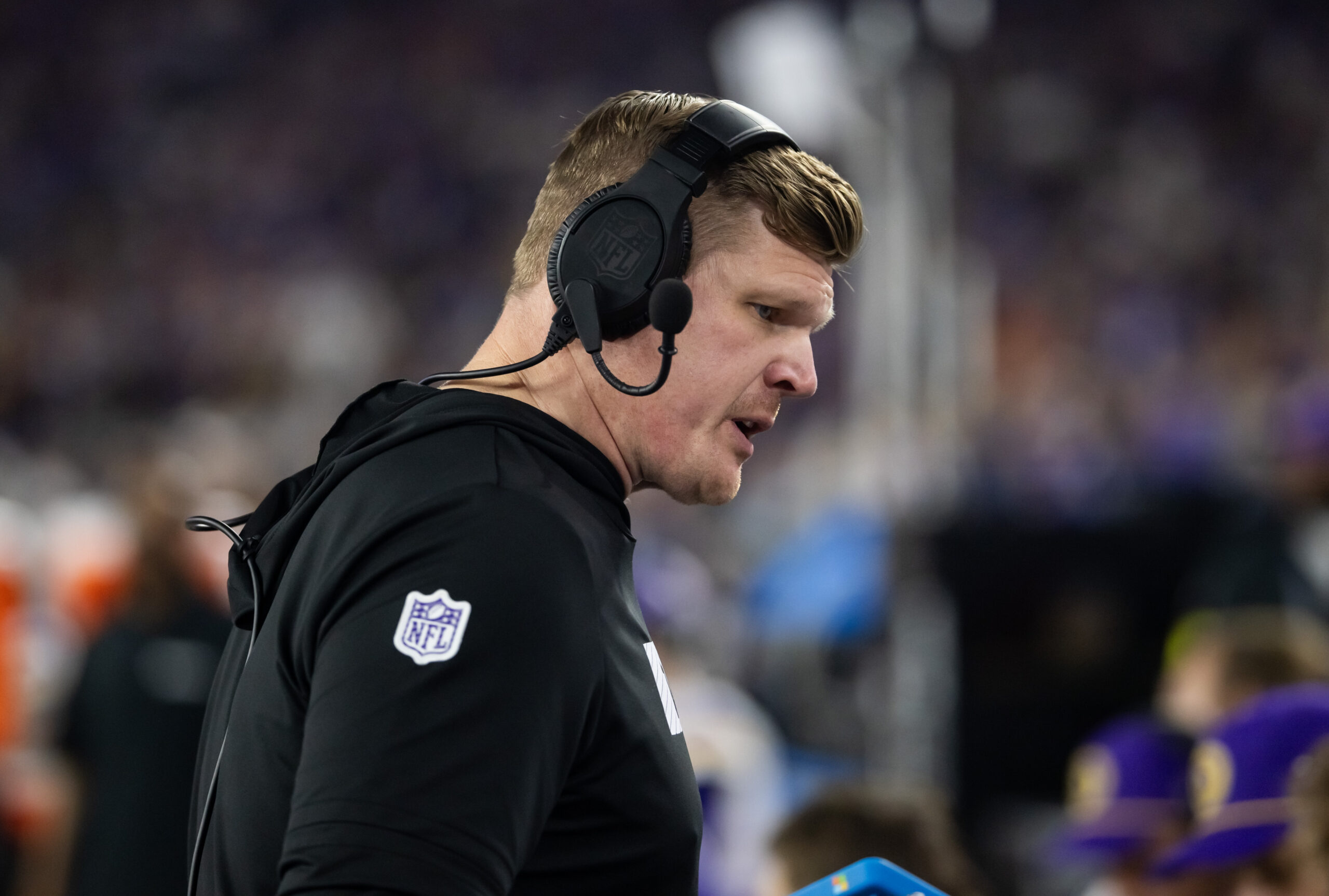 Jan 13, 2025; Glendale, AZ, USA; Minnesota Vikings offensive line coach Chris Kuper against the Los Angeles Rams during an NFC wild card game at State Farm Stadium. Mandatory Credit: Mark J. Rebilas-Imagn Images