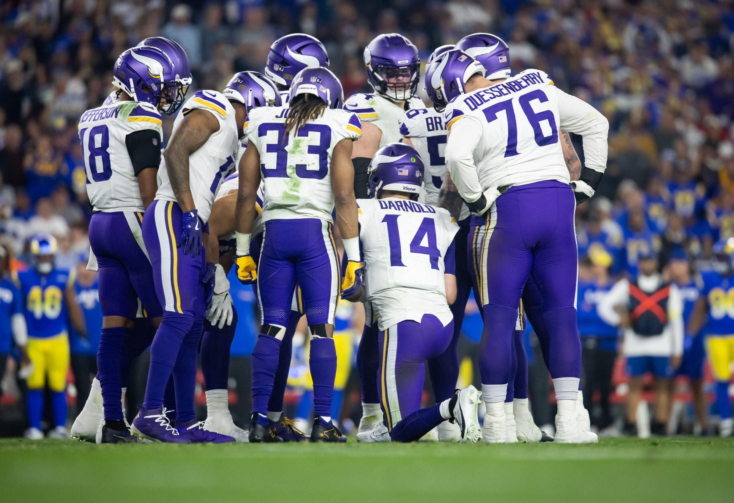 Jan 13, 2025; Glendale, AZ, USA; Minnesota Vikings quarterback Sam Darnold (14) in the huddle with teammates against the Los Angeles Rams during an NFC wild card game at State Farm Stadium. Mandatory Credit: Mark J. Rebilas-Imagn Images