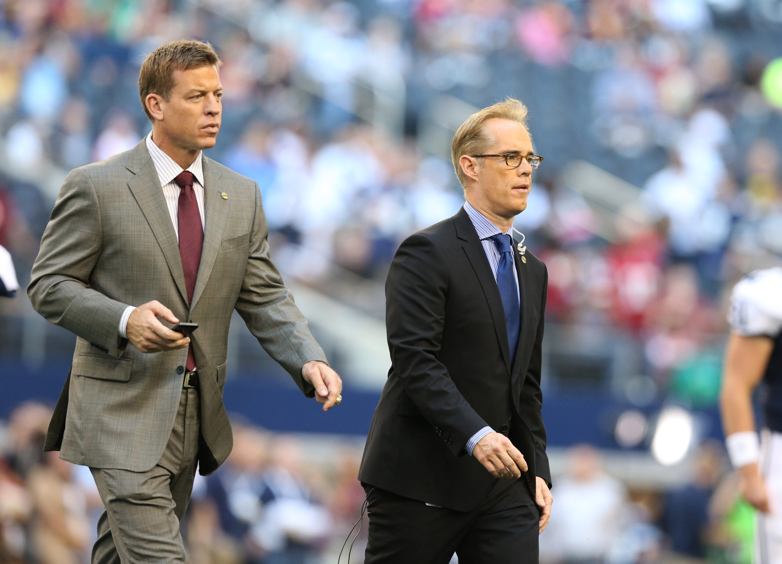 Nov 22, 2012; Arlington, TX, USA; Fox announcers Troy Aikman (left) and Joe Buck on the field prior to the game with the Dallas Cowboys playing against the Washington Redskins on Thanksgiving at Cowboys Stadium. Mandatory Credit: Matthew Emmons-Imagn Images