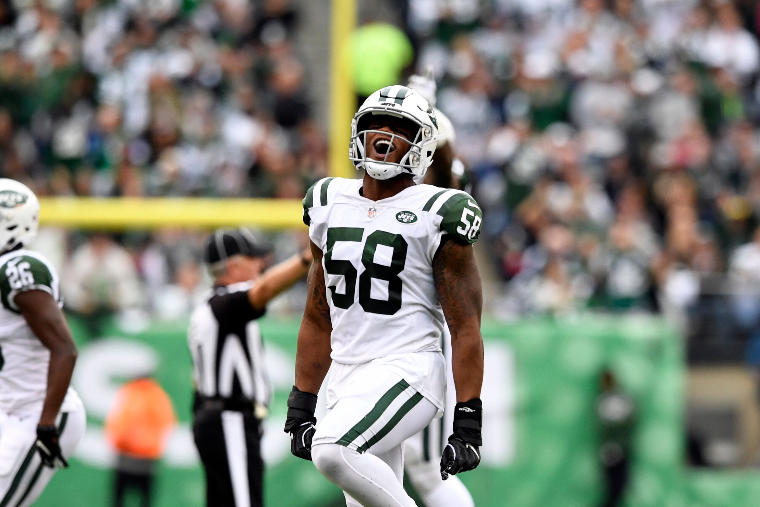 New York Jets linebacker Darron Lee (58) celebrates an Indianapolis fumble, recovered by teammate Jordan Jenkins in the first half. The New York Jets host the Indianapolis Colts in Week 6 on Sunday, Oct. 14, 2018, in East Rutherford. Nyj Vs Ind