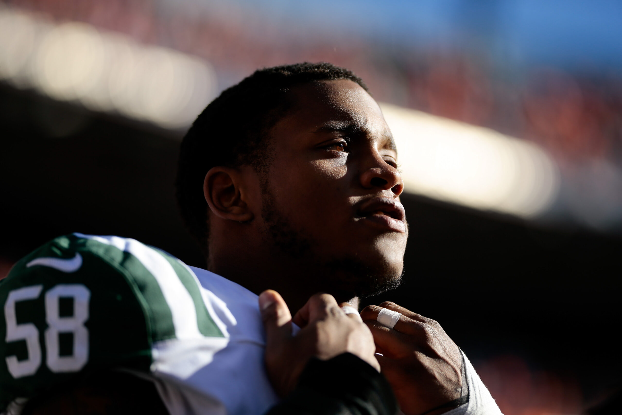 Dec 10, 2017; Denver, CO, USA; New York Jets inside linebacker Darron Lee (58) before the game against the Denver Broncos at Sports Authority Field at Mile High. Mandatory Credit: Isaiah J. Downing-Imagn Images