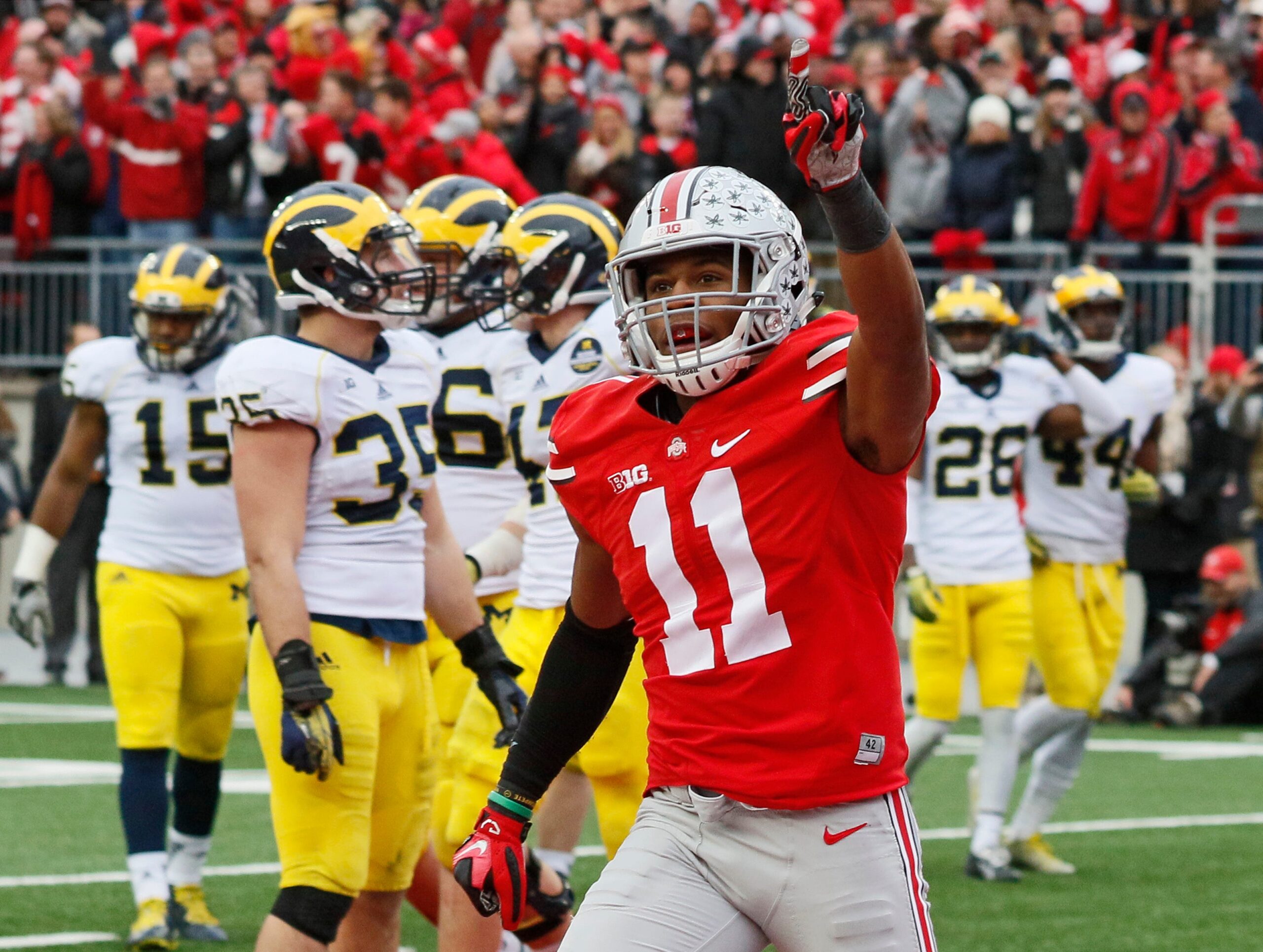 Ohio State Buckeyes defensive back Vonn Bell (11) celebrates a fumble returned for a touchdown by teammate linebacker Darron Lee (43) during the 4th quarter of the NCAA football game against the Michigan Wolverines at Ohio Stadium on Nov. 29, 2014.