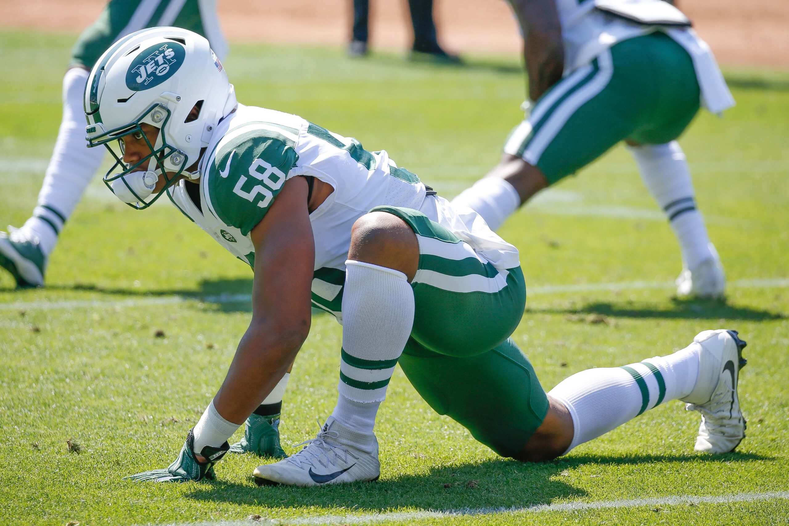 Sep 17, 2017; Oakland, CA, USA; New York Jets outside linebacker Darron Lee (58) warms up before the game against the Oakland Raiders at Oakland Coliseum. Mandatory Credit: Stan Szeto-Imagn Images