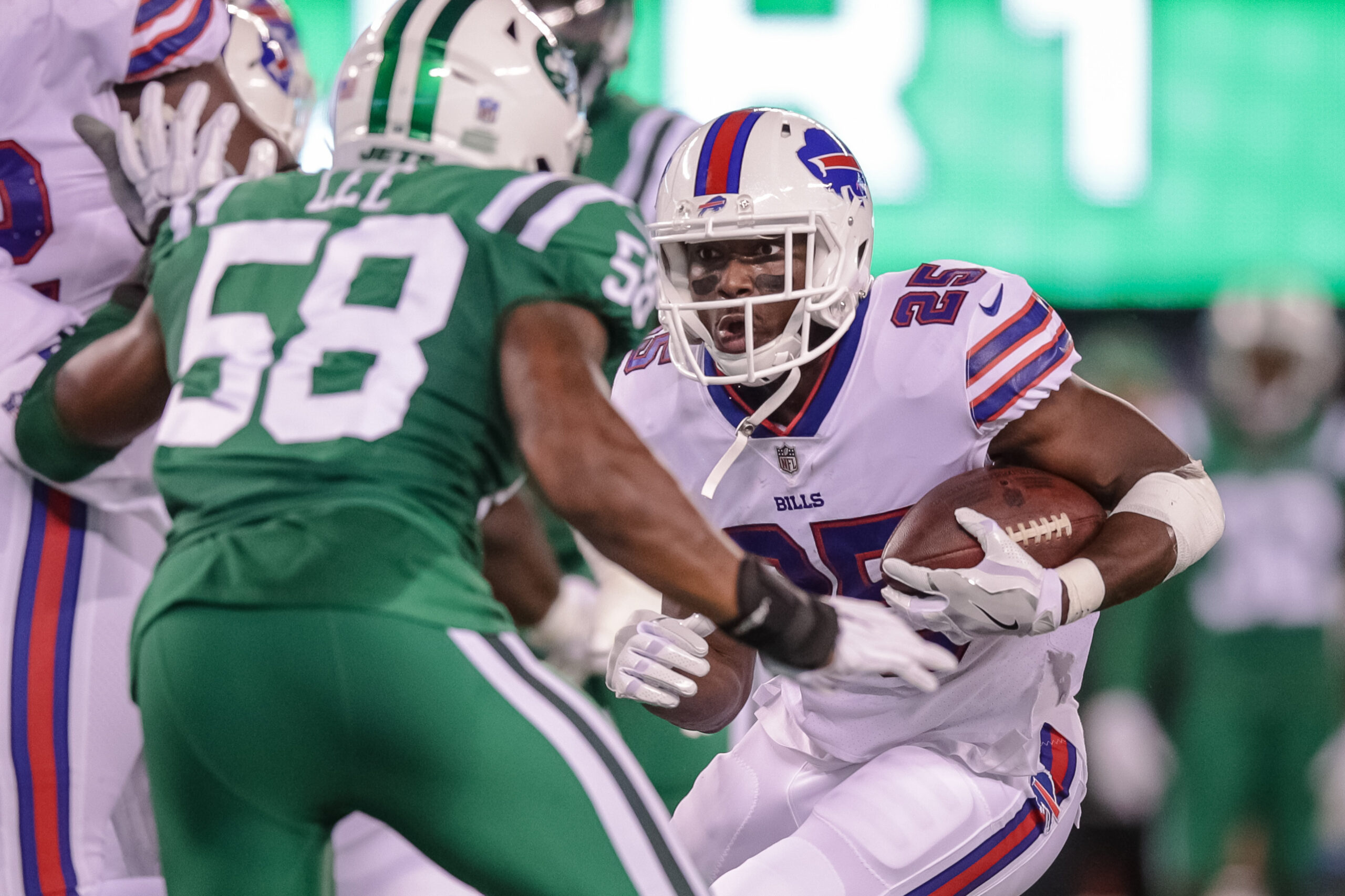 Nov 2, 2017; East Rutherford, NJ, USA; Buffalo Bills running back LeSean McCoy (25) carries the ball as New York Jets inside linebacker Darron Lee (58) defends during the first half at MetLife Stadium. Mandatory Credit: Vincent Carchietta-Imagn Images