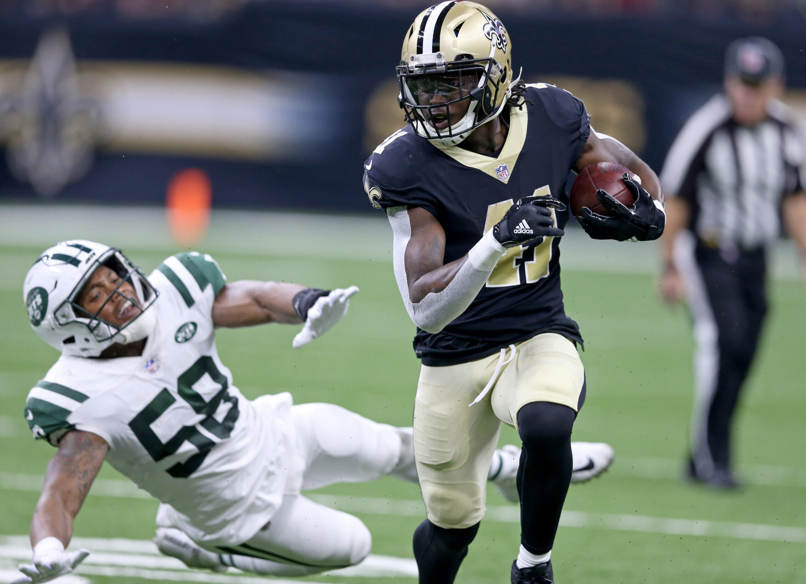 Dec 17, 2017; New Orleans, LA, USA; New Orleans Saints running back Alvin Kamara (41) is pursued by New York Jets linebacker Darron Lee (58) in the second quarter of the game at the Mercedes-Benz Superdome. Mandatory Credit: Chuck Cook-Imagn Images