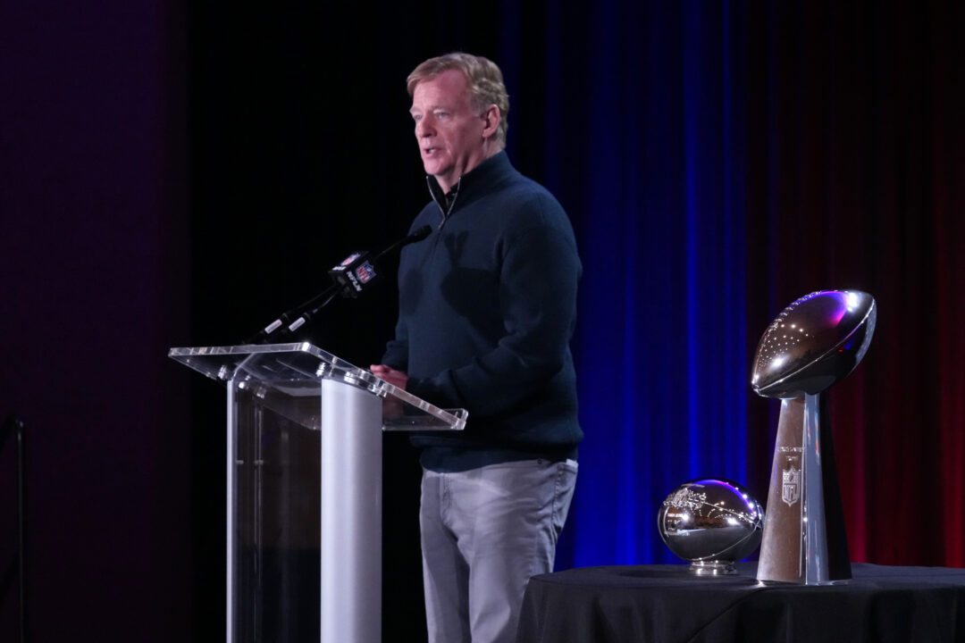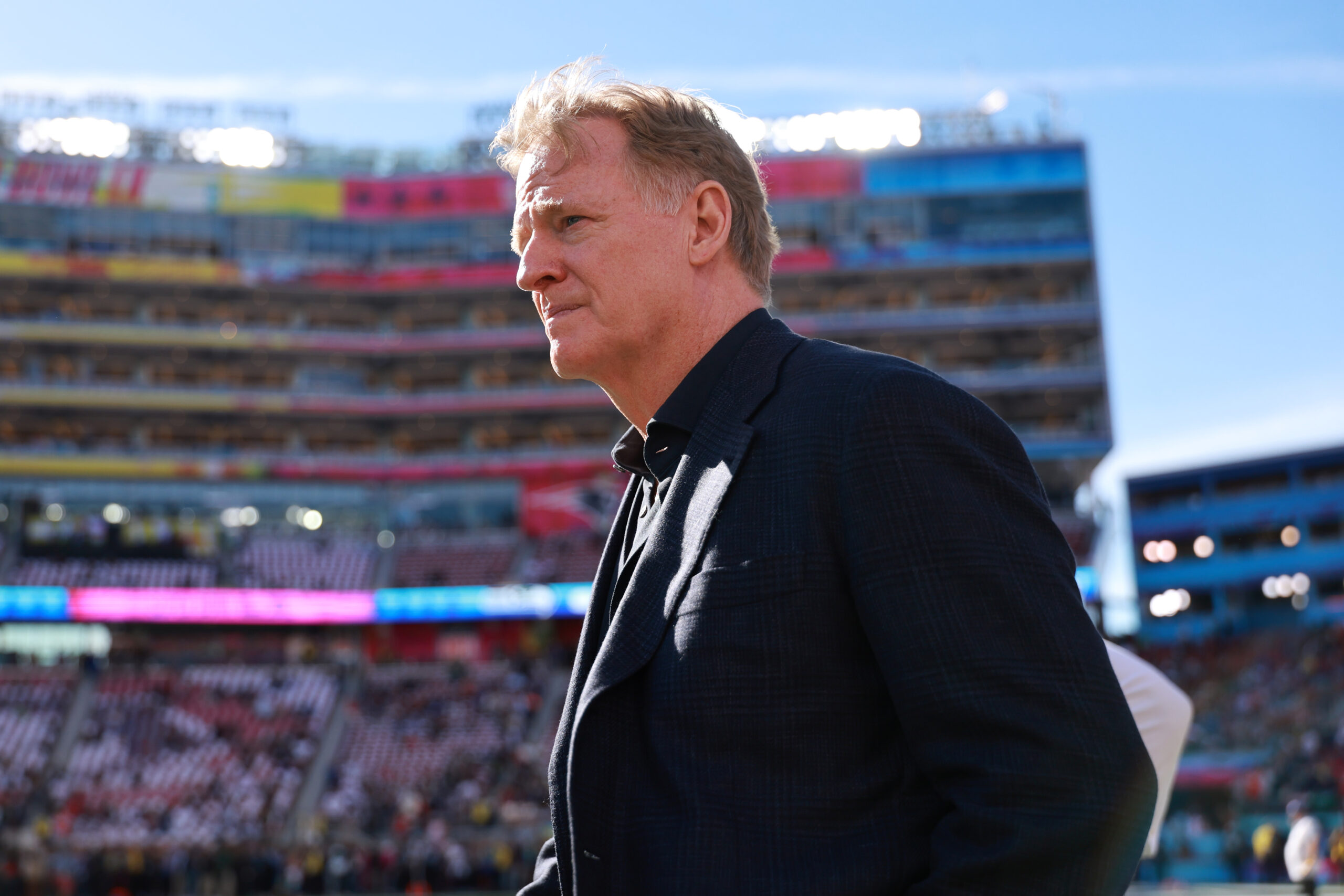 Feb 8, 2026; Santa Clara, CA, USA; NFL commissioner Roger Goodell looks on before Super Bowl LX between the Seattle Seahawks and the New England Patriots at Levi’s Stadium. Mandatory Credit: Mark J. Rebilas-Imagn Images