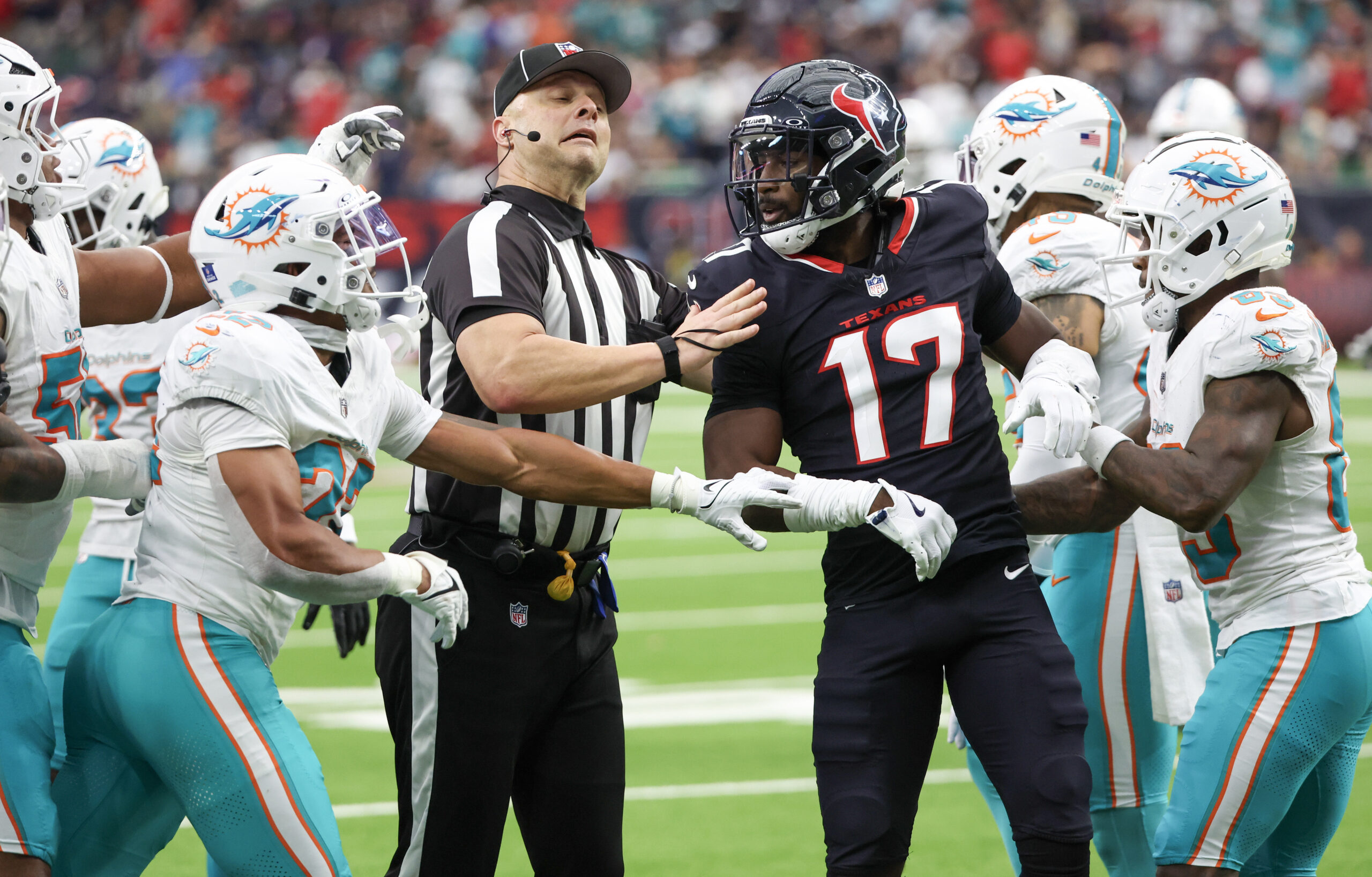Dec 15, 2024; Houston, Texas, USA; Miami Dolphins safety Elijah Campbell (22) and Houston Texans cornerback Kris Boyd (17) get into a shoving match after the Dolphins recovered a fumble in the third quarter at NRG Stadium. Mandatory Credit: Thomas Shea-Imagn Images