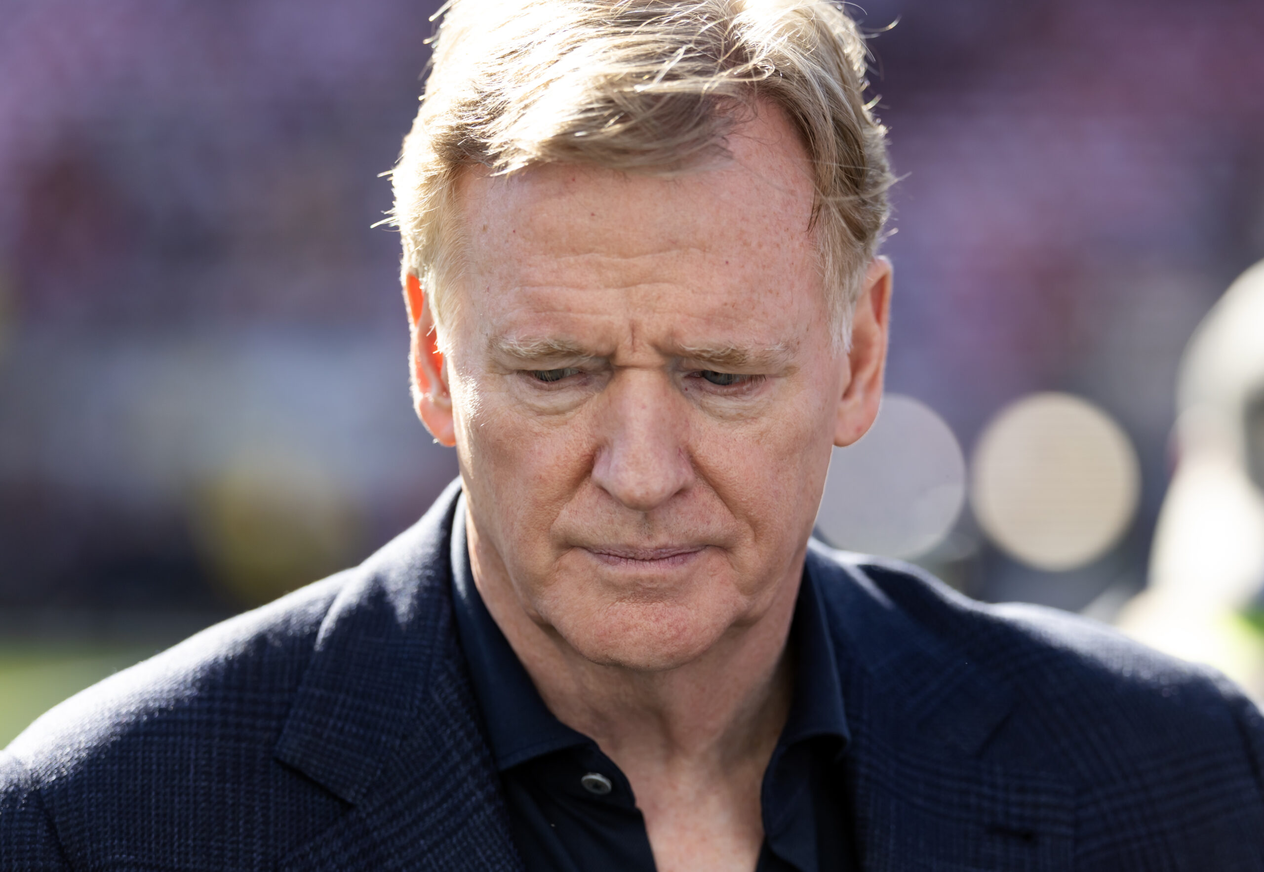 Feb 8, 2026; Santa Clara, CA, USA; NFL commissioner Roger Goodell looks on before Super Bowl LX between the Seattle Seahawks and the New England Patriots at Levi’s Stadium. Mandatory Credit: Mark J. Rebilas-Imagn Images