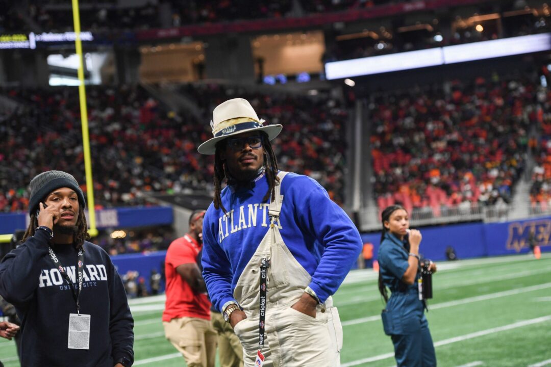 Dec 16, 2023; Atlanta, GA, USA; Former NFL quarterback Cam Newton watches a game between the Howard Bison and Florida A&M Rattlers in the first half at Mercedes-Benz Stadium. Mandatory Credit: Brett Davis-Imagn Images