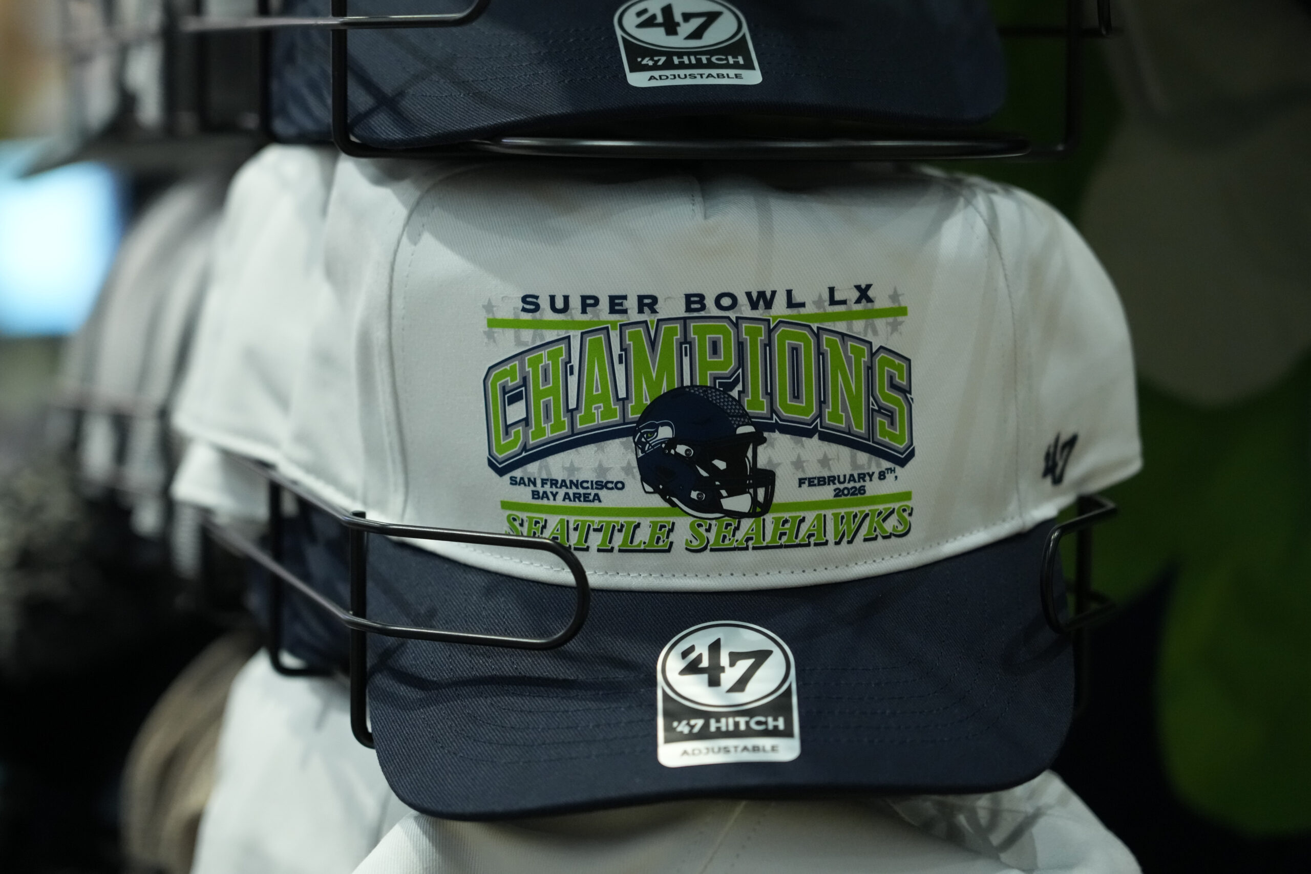 Feb 11, 2026; Seattle, WA, USA; Seattle Seahawks Super Bowl LX champions 47 brand hats at the Hudson store at the Seattle-Tacoma International Airport. Mandatory Credit: Kirby Lee-Imagn Images
