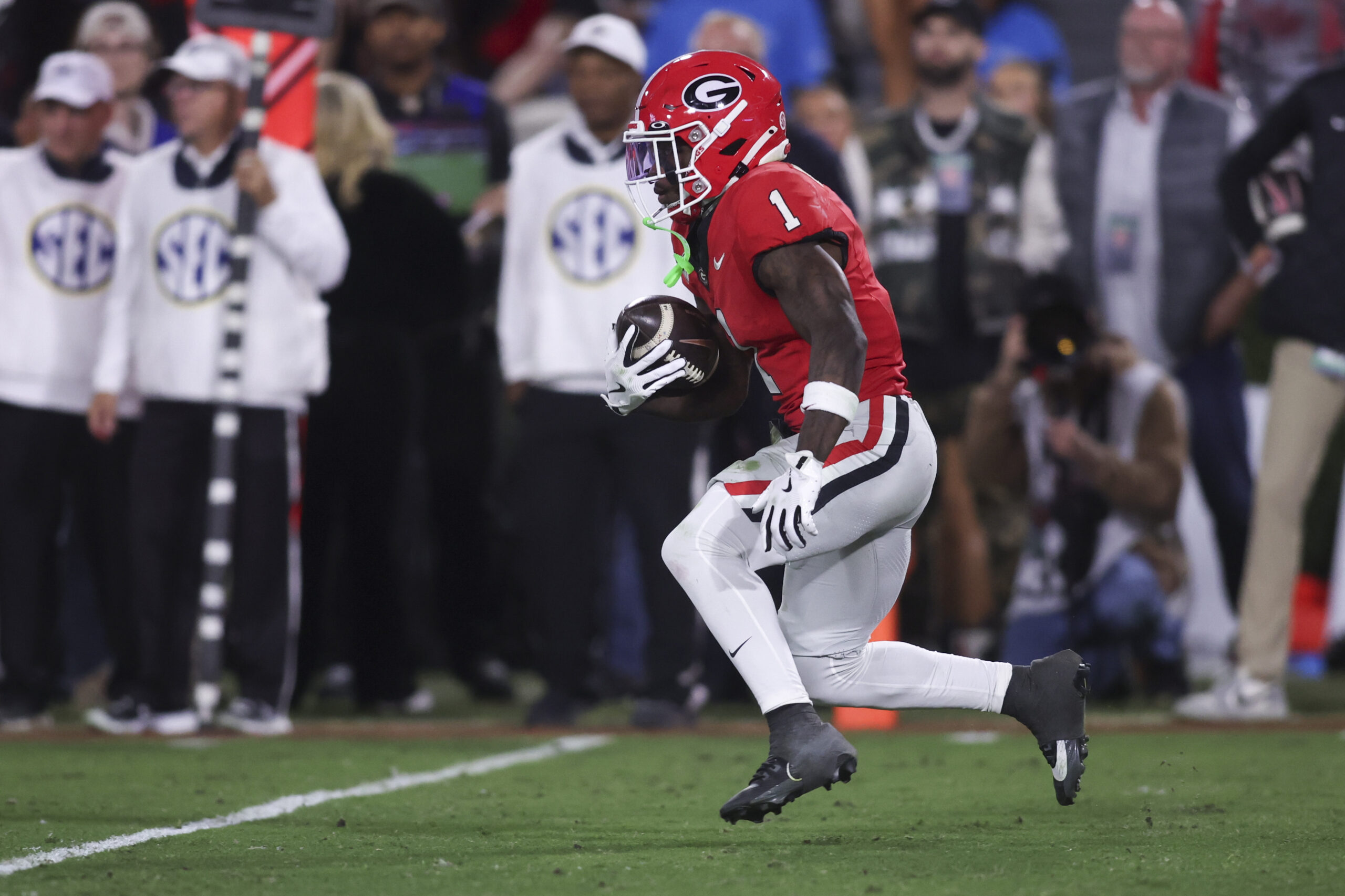 Nov 15, 2025; Athens, Georgia, USA; Georgia Bulldogs wide receiver Zachariah Branch (1) runs the ball in the second half against the Texas Longhorns at Sanford Stadium. Mandatory Credit: Brett Davis-Imagn Images