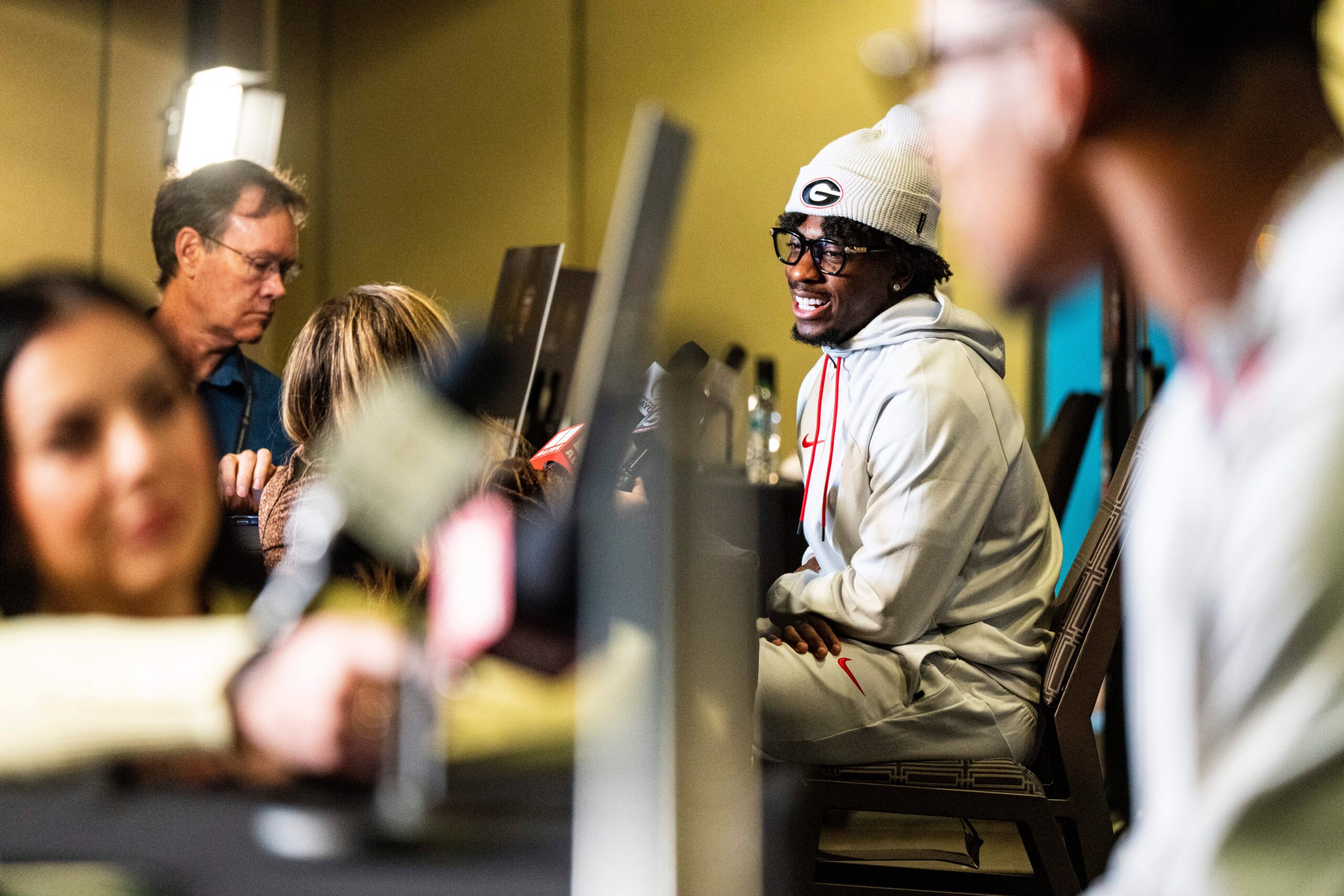 Georgia wide receiver Zachariah Branch (1) takes questions from the press during the Sugar Bowl and College Football Playoff quarterfinals Media Day at Sheraton New Orleans Hotel in New Orleans, La., on Tuesday, Dec. 30, 2025. Players and coaches from Ole Miss and Georgia took questions from the press.